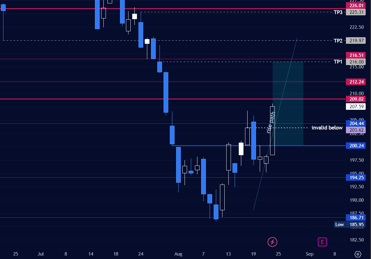 With an extra week, I would be targeting a run into 225, with strong overshoot possibly testing 228. Below 203.50 this play may lose steam, we do not want to see a close near that - if anything, a quick retest and reject.