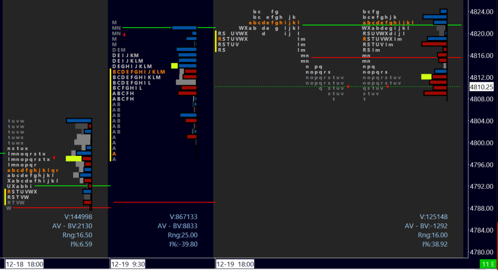 Note Tuesday’s ETH session had numerous tests of 4803 which were capped ahead of open. If you were hesitant on the direction at open, the B period low was your clue to go long (I personally took the long there off of the retest of 4803). This is another straightforward way to use the profile. Resistance to support and vice-versa.