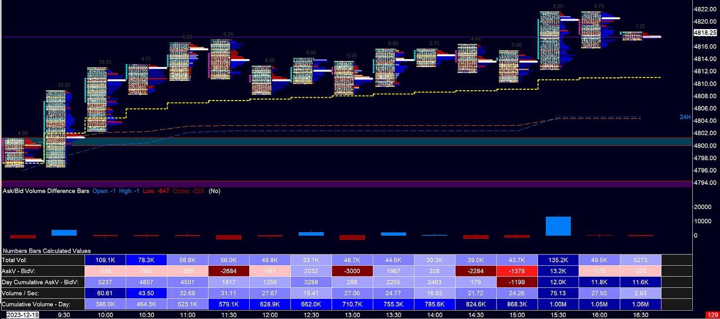 Volume was otherwise very low however, and sellers while present were very reserved. The 30m footprint sums up the (in)action below. This is expected ahead of the holidays as people are away from their desks. Note the heavy buying delta at the close of the session. This is not a bullish signal as it is accounts being cash settled at the end of the session (typically the last 45 minutes of RTH)