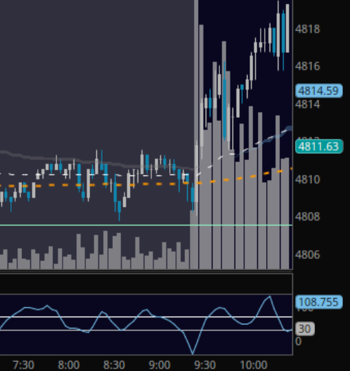 The upward grind is relentless. Yesterday’s premarket plan suggested buyer strength in the case of strong closes above the ONH/4815 on the 15m or the hourly. This is how the open played out, with dips bought for returns over the magic number 4815. The pivot area (4805) was untouched at the opening bell, another potential sign of strength.