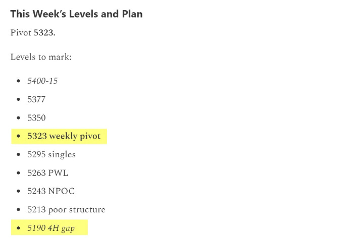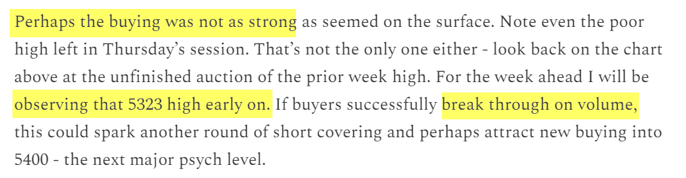 Taking a look at last week’s outlook, I favored buyers if and only if on a break of 5323 on volume, otherwise leaving room for sellers to take charge early in the week. The high of the week was a) 5317 - the level; and b) buying volume was reserved - the condition.