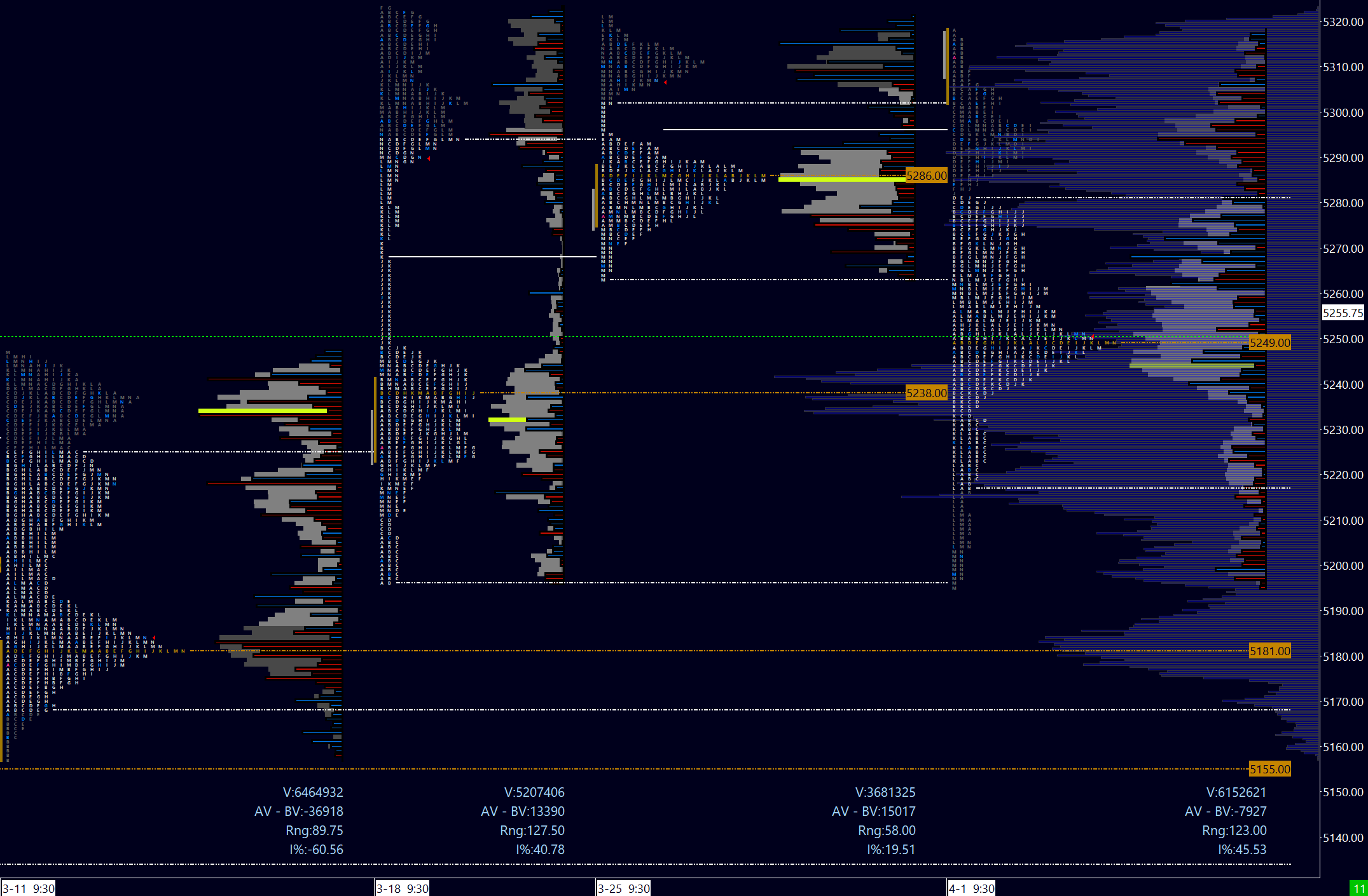 Last week’s close at 5250 is an exacting level of indecision (a term I’ve coined), but given the strong sell delta I suspect sellers are looking for further reward IF time is spent below the prior balance low of 5263. I will thus use this as a straightforward pivot heading into the week.