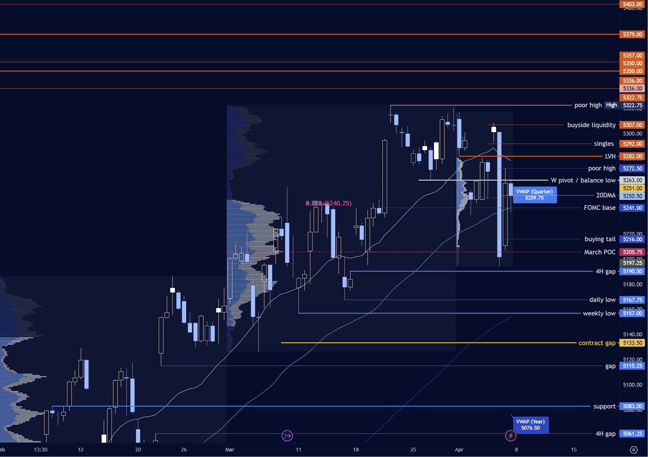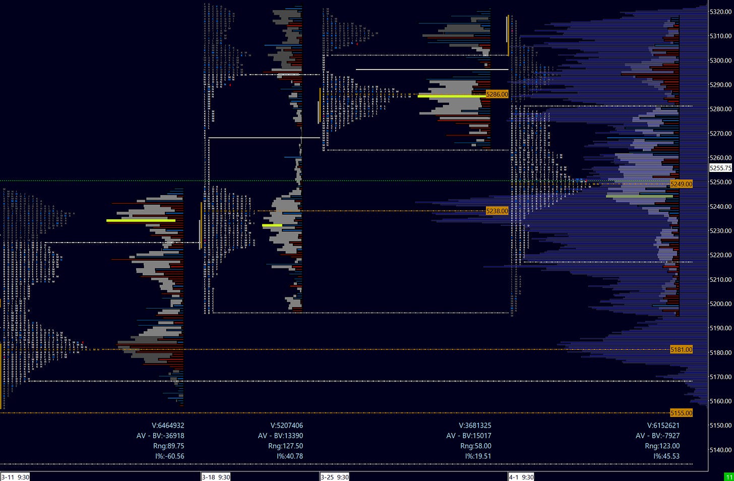 For last week’s review, I want to explore some of the concepts in the chart above rather than over-analyze individual days. This is a great lesson for using structural levels from the profile in the context of intraday trading. Again, zooming in on precise entries may be done with a tick chart, the 5m, the 1m - whatever your preference is. But the profile gives you a great sense of areas more likely to get attention, either as resistance, support, or as a magnet.