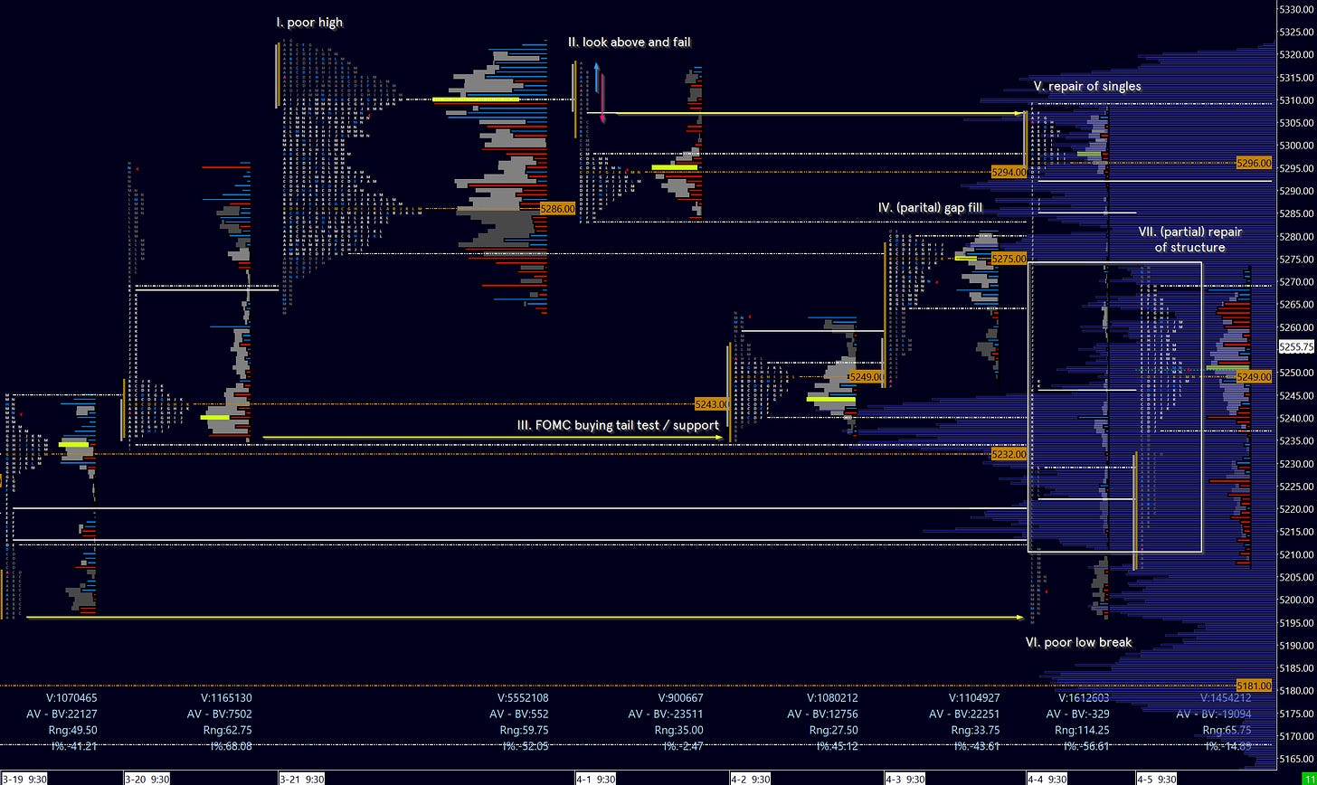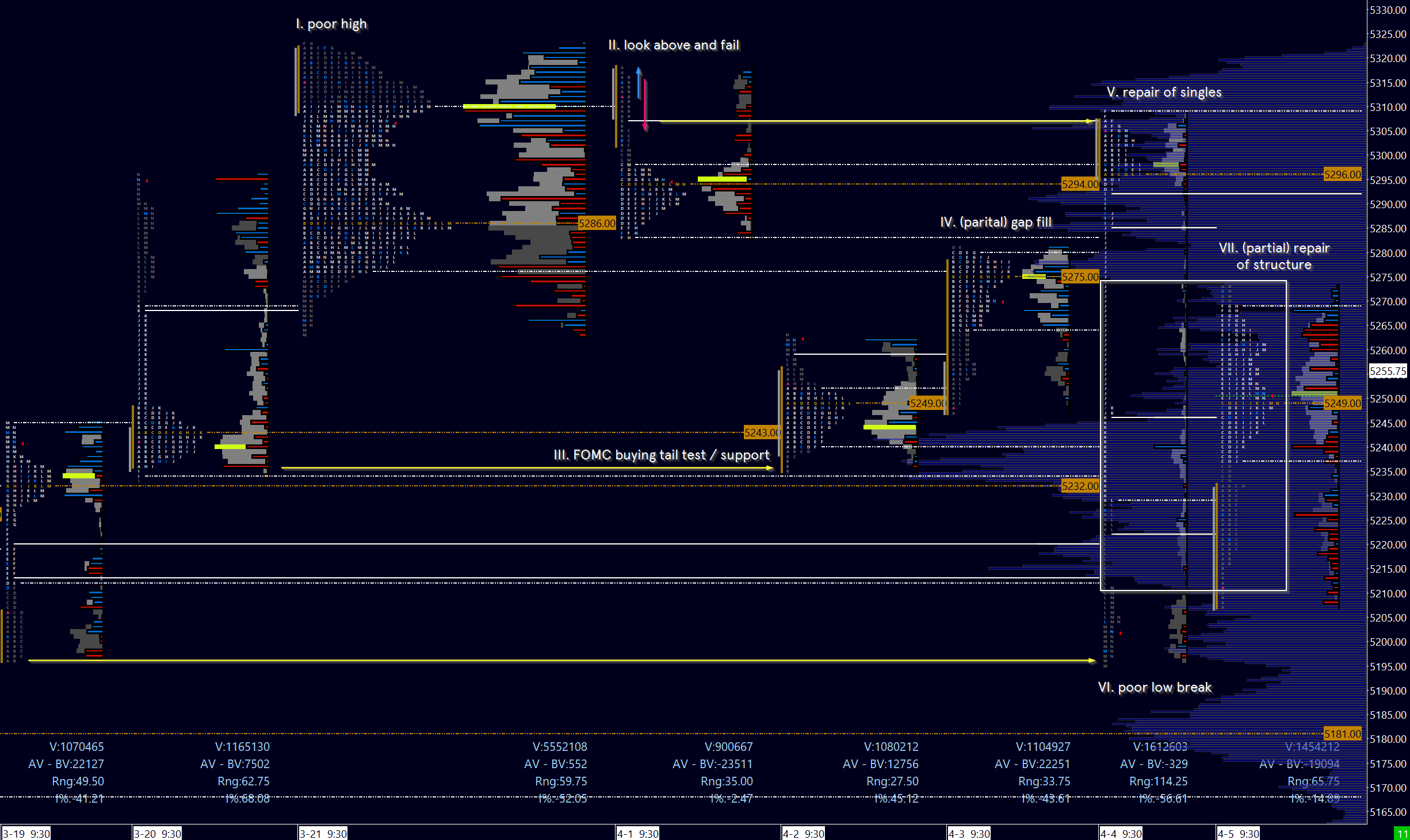 VII. Repair of poor structure. Thursday’s liquidation left behind four sets of singles, which are frequently later revisited in the auction process. Friday’s look below and fail of the prior M period spike high 5210 saw buyers step in - natural targets above would be the fills of the four sets of singles. Two were filled, and a poor low on one partial fill suggests an incomplete auction above.