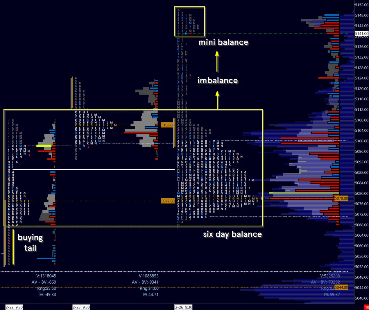 Breakout came Friday. A painful day for many fellow traders attempting short. Remember the rule: go with the break of balance unless rejected (by other traders, don’t be a hero!). In which case an equal and opposite reaction can take place, often in the form of a traverse of the value area. We then arrived at the 5146 level indicated as the plan, and just three ticks shy of the 5150 psych level.