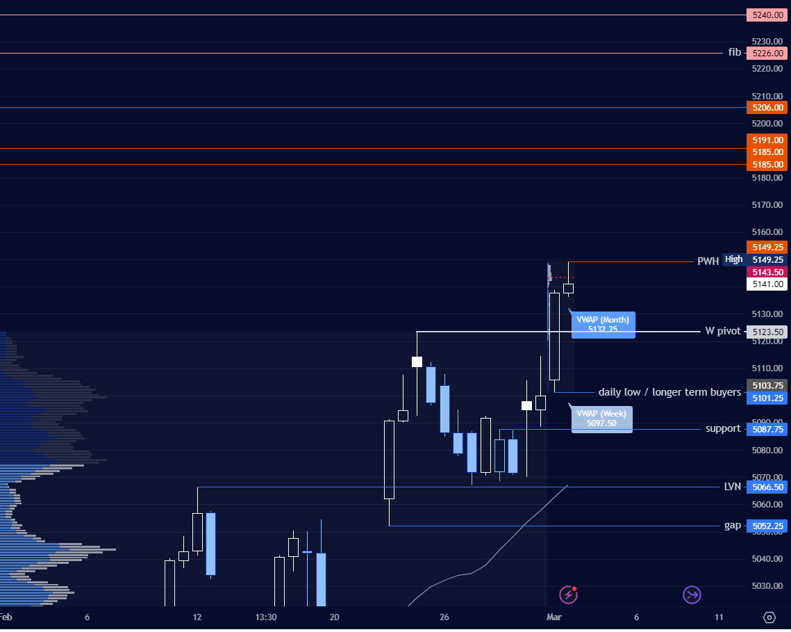 However, buyers successfully defended the 5067 level, putting in a higher low Wednesday. Thursday broke the short-lived daily OTFD, taking control away from sellers. Not only this but the 5112 gate (which was broken and rejected on February 23, Image 3) was again tested on Thursday, with high volume market on close (MOC), indicating participants were fine with paying the closing price. A strong conviction if you ask me.
