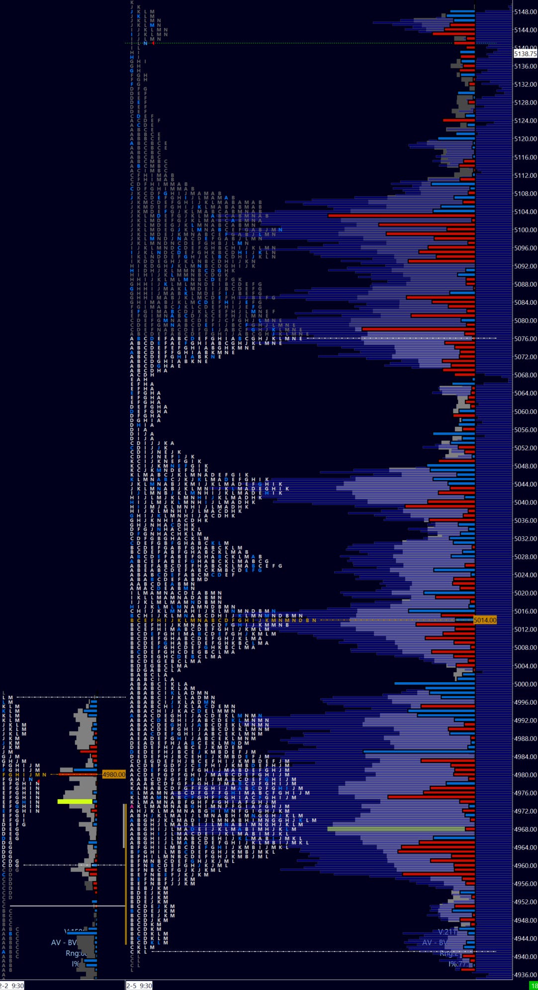 Sellers look for a rejection of the breakout with a daily close below the 5123.50 breakout and ideally a traverse of last week’s value area to 5071, with a break of weekly OTU just below at 5066. Short-term (5 day) value is at 5078 while medium-term (20 day) further below at 5014. Note the volume shelf at 5046. This is a clear area for longer-term buyer support (if we get there).