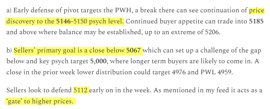 b) Sellers closing below pivot look to traverse prior week value area to 5071, with 5101 and 5087 potentially offering a responsive bid along the way. Further below is 5046 for a longer-term support.