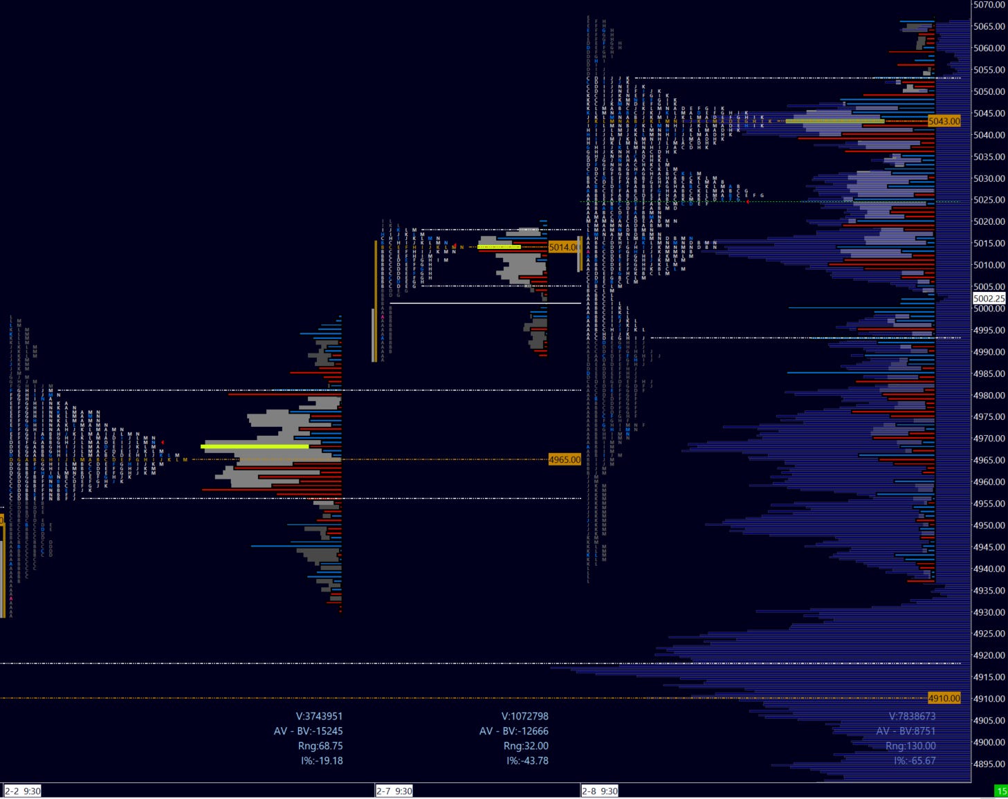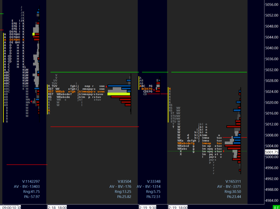Pivot 5012. A solid hourly close above the pivot would like to then see a strong close above Friday 4527 VAL for more upside potential. Sellers need to keep the pressure early on - preferably spending time below 5004 LVN to then knock out the 4990s for any downside progress.