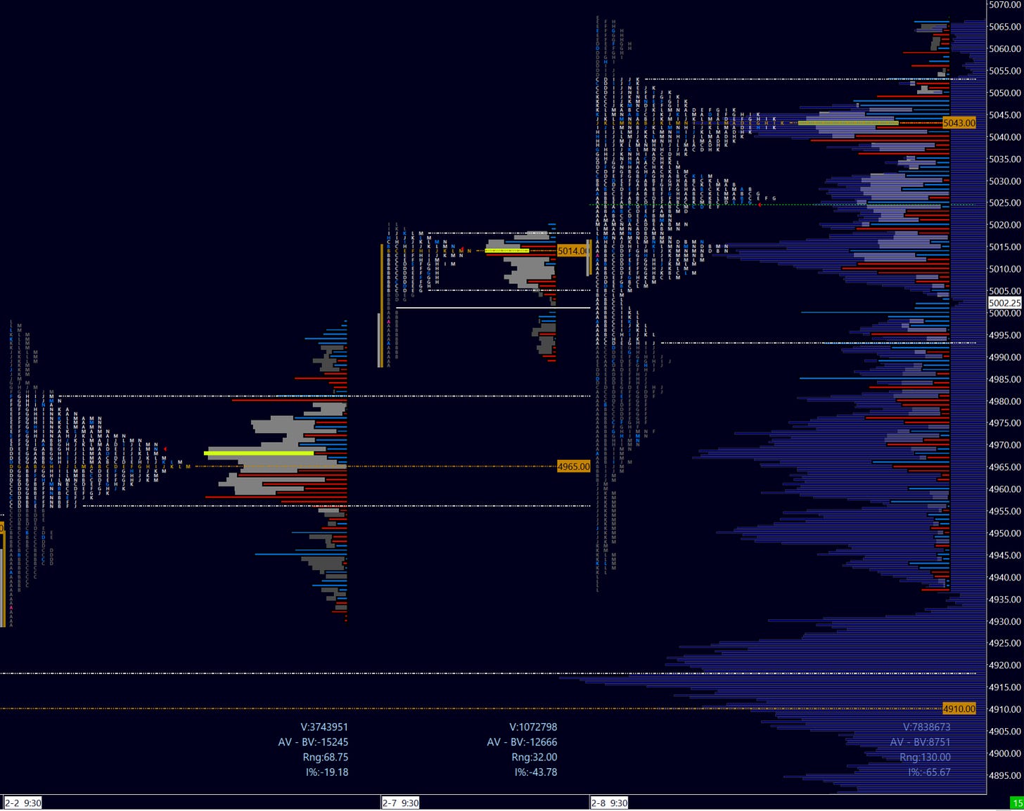 Buyers’ goal is to see an hourly close within Friday’s value area (above 5027) for a traverse to the highs. A break of the nascent daily OTFD implies a rejection of further downside. This can propel an aggressive move to the upside to new ATHs. On the other side, sellers want to gain momentum below Friday’s low - a successful hourly close below 4990 could lead to 4972 being challenged. A break of that daily low could be the gate to lower levels and the ball in sellers’ court.