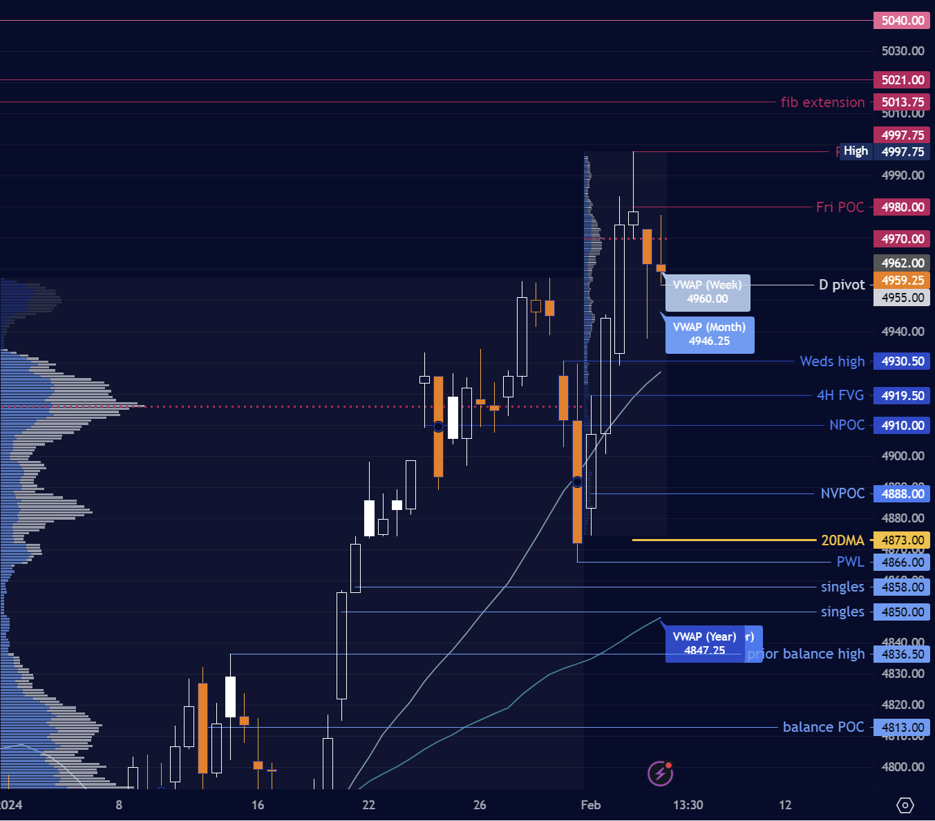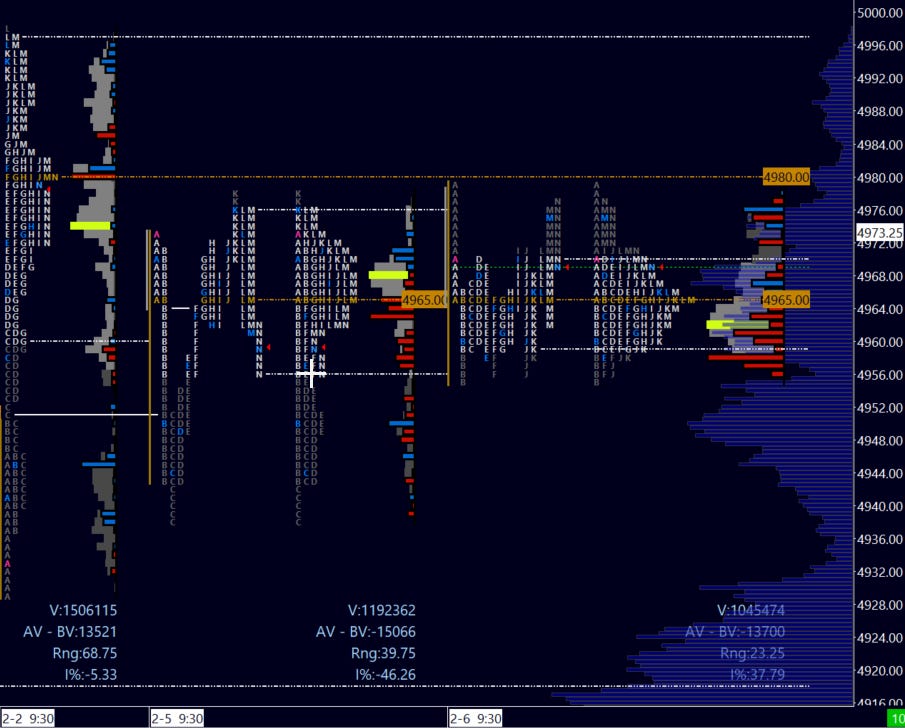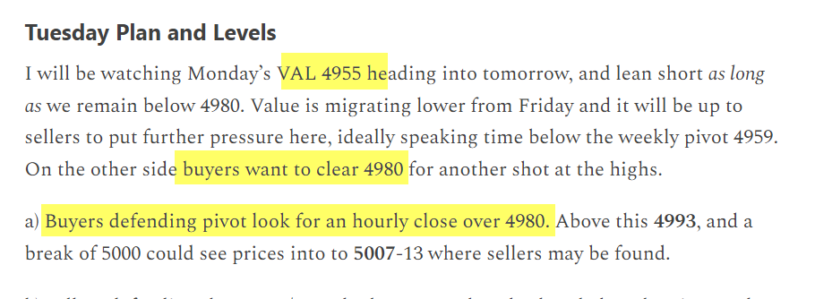 I will be watching 4967 heading into tomorrow - not only was there notable order flow at this level Tuesday (at one point a 3.5k order on the offer), but also coinciding with the three day balance VPOC (4968). I lean long with a successful close above 4980 - or a break above is rejected by an hourly close back below then a short is favored. An hourly close above 4980 could result in another test of 5,000 and potentially gating to higher prices.