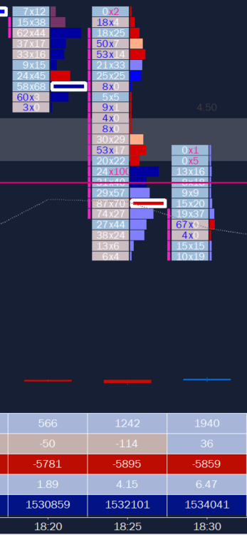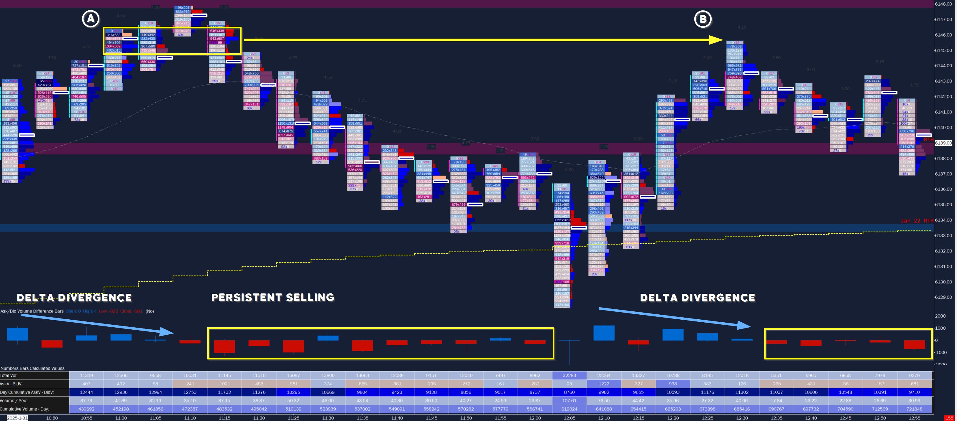 A. In this area I noted the high delta into the offer (heavy blue) and subsequently into the offer (dark reds). I typically draw out a liquidity band going forward from this area. I have not done that in this set of charts as I was watching a prior liquidity area above.
