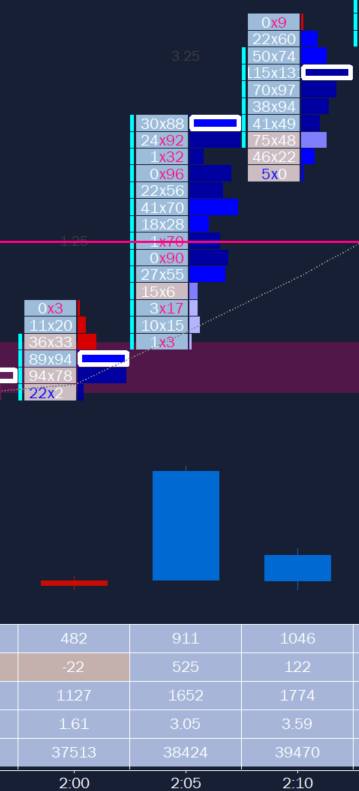 For those new to footprint charts, my color settings indicate order flow delta. That is the difference between trades into the bid and offer at a specific price. The darker the color, the higher the delta. My settings may be different than yours, I have simply identified the deltas that work for me and my product, ES.