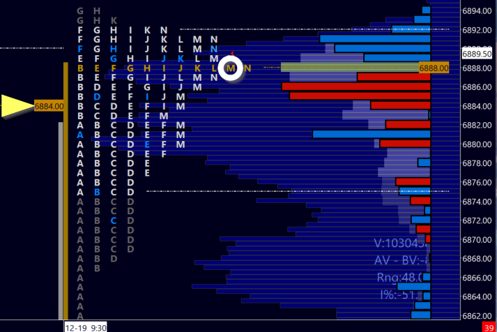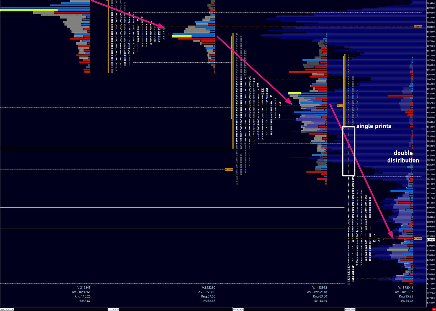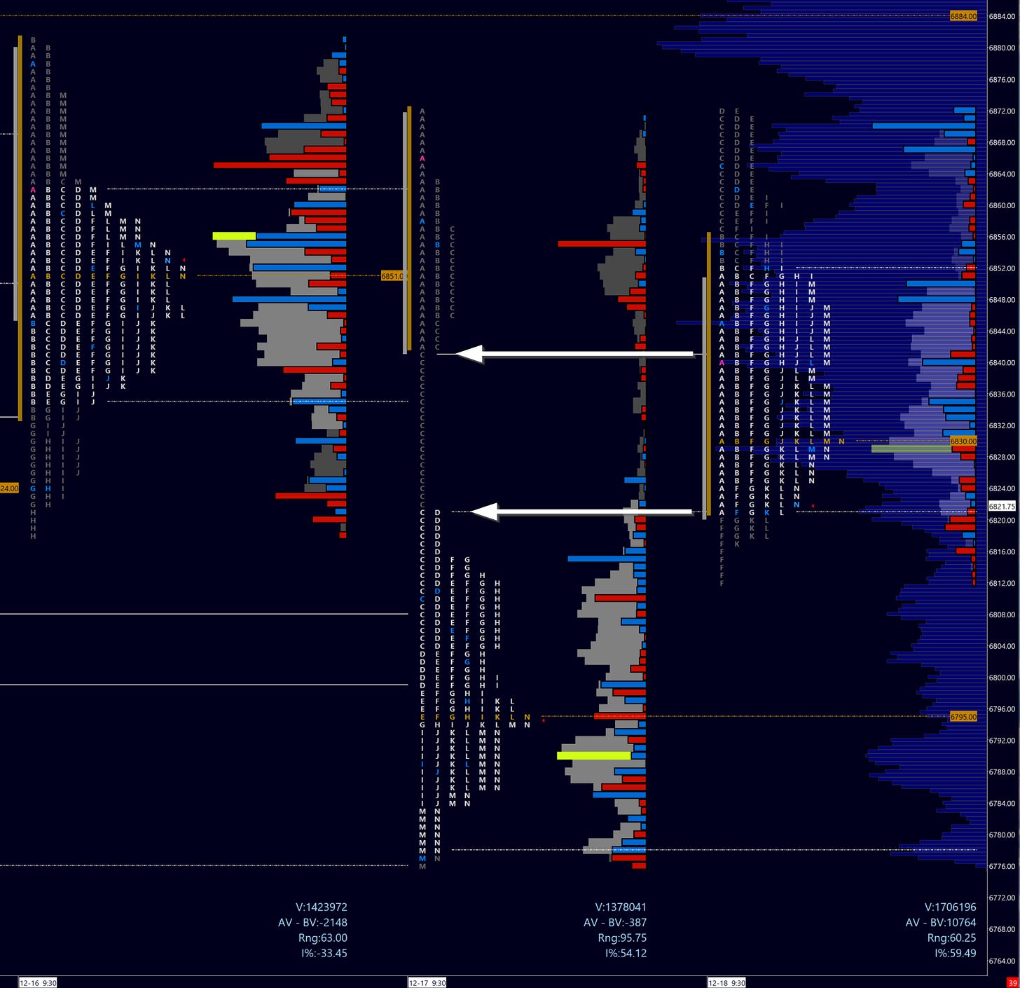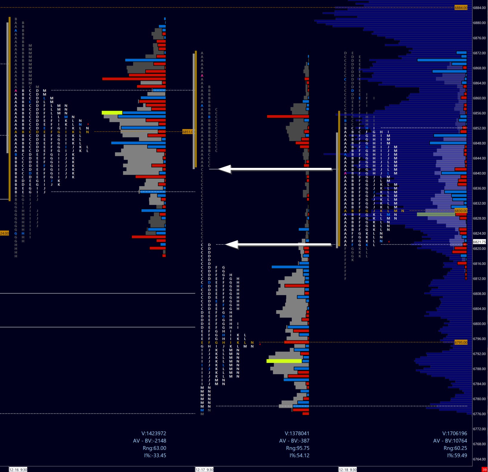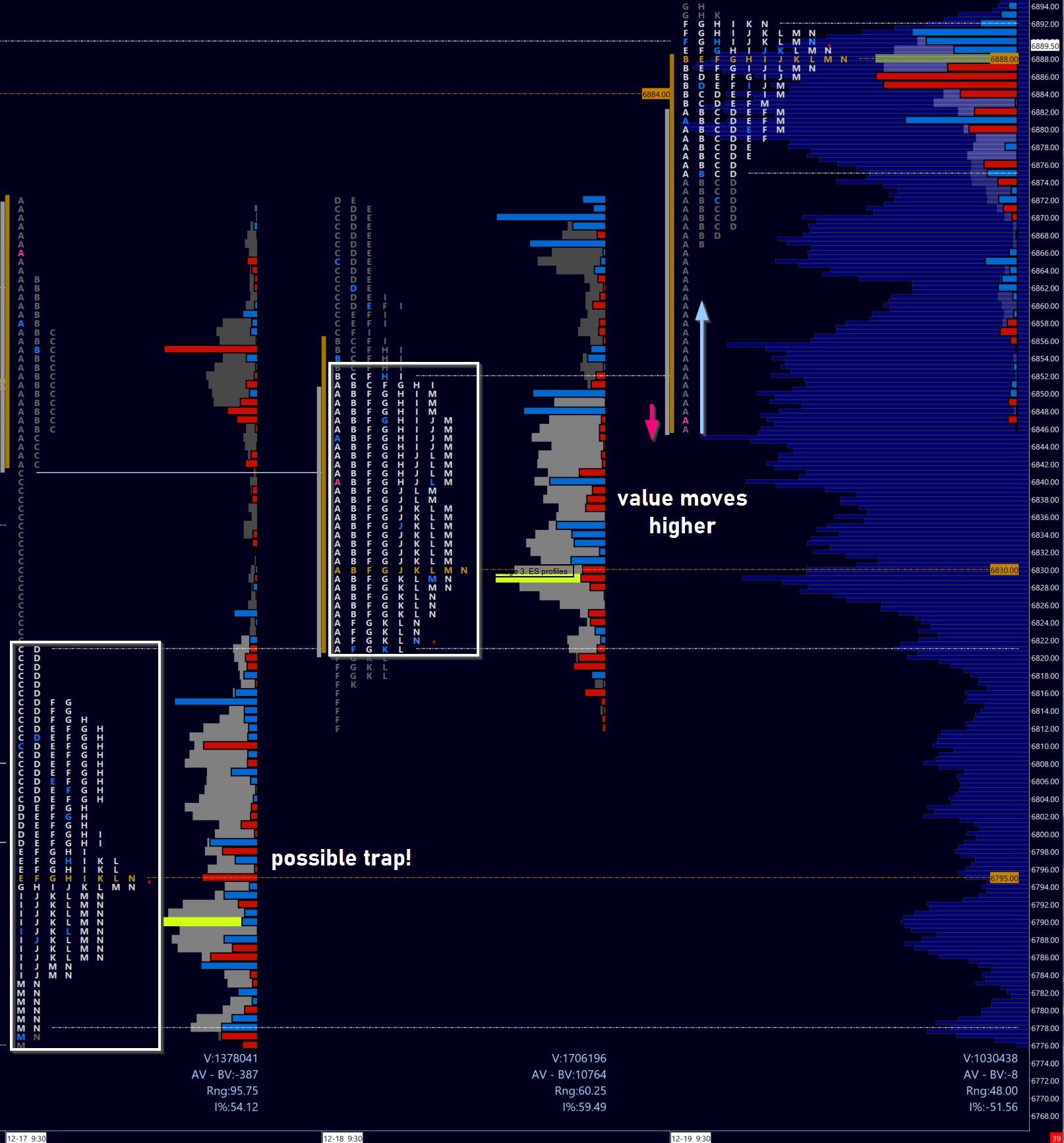 Take a look to the profiles above. Beginning on the 15th, we have two profile that accept value lower. You can note the even distribution of prices as the POC shifts down on two successive days (Monday the 14th saw the POC at 6913).