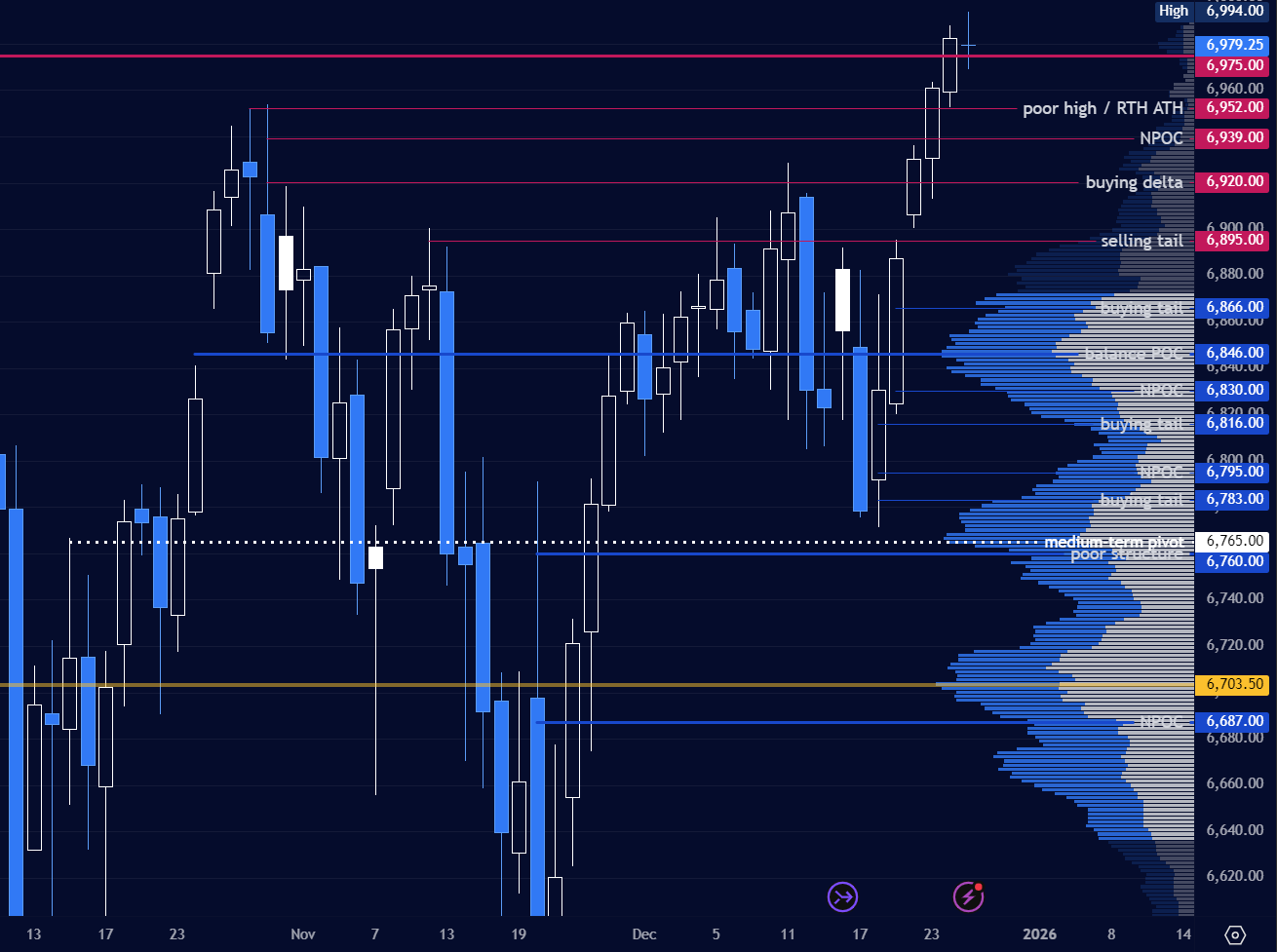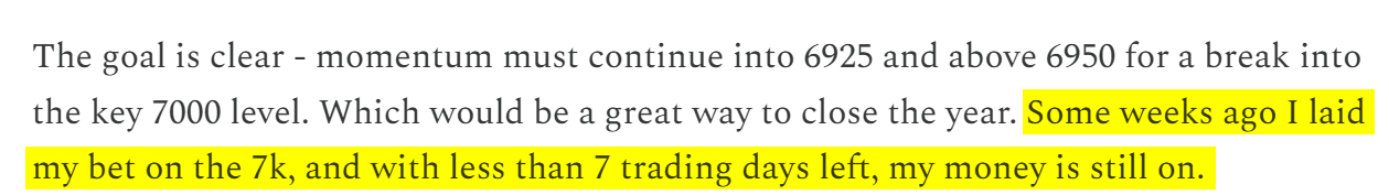 My Santa Rally prediction of 7k only had 150 points to go from here. I was confident in my thesis by the day’s close, which notched a few points above Monday’s NPOC of 6884.
