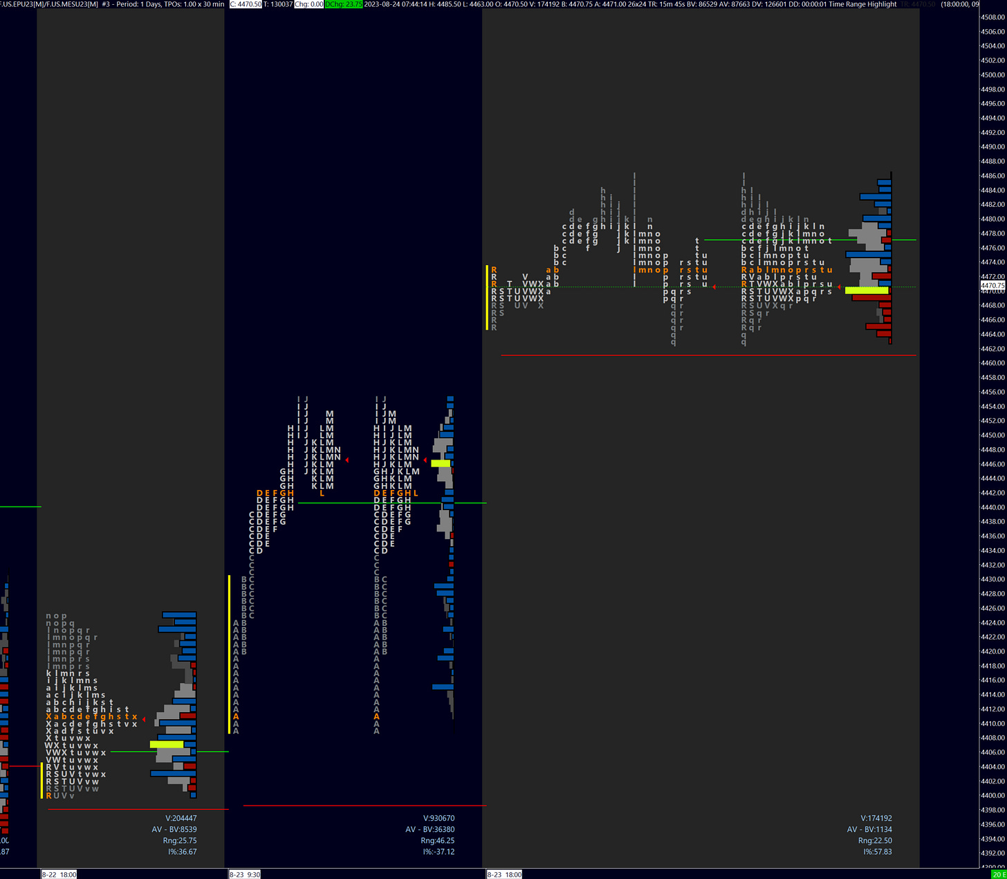 I am watching 4454, or yesterday’s intraday high (and poor high), as an intraday pivot. We saw a large gap up on the NVDA beat - look for this gap to hold. A loss of the gap and trade into yesterday’s value area is a bearish event given the context.
