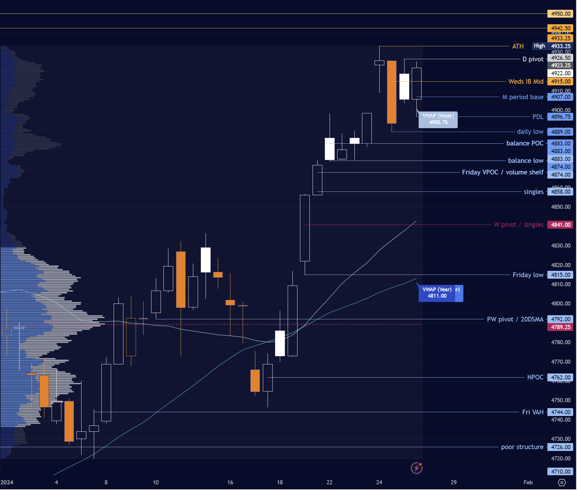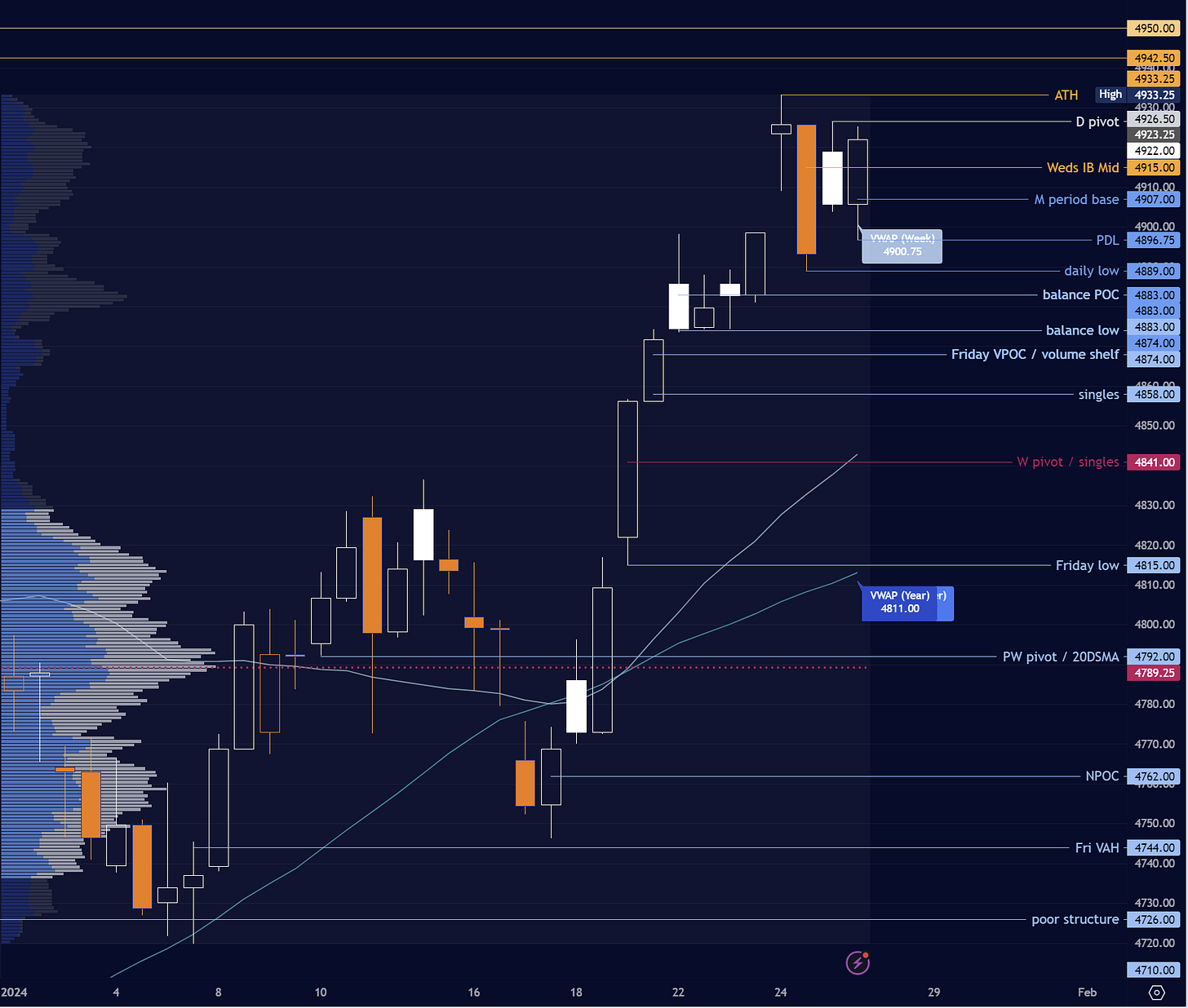 Plan largely unchanged. On review, I was a bit off with the prior day pivot although the levels worked well. Going into Friday 4927 will be key as the day pivot. This has the potential to let off some pressure in the form of price discovery above. Buyers look to spend time above 4900 and close above the pivot, on the other hand sellers still need to show an hourly close below 4900 to open any downside progress.