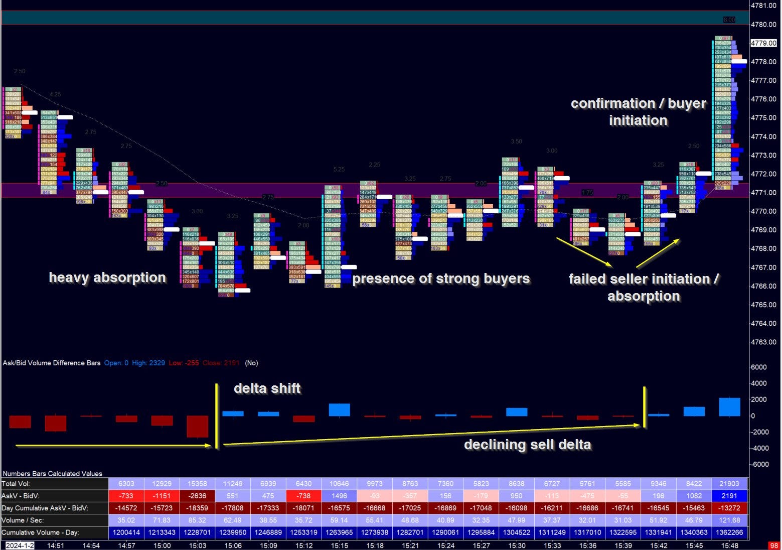b) Sellers defending 4777 aim for a break of ONL/4764 to target 4748 where patient buyers may step in. In case of further aggression, we could see a fill of singles at 4736 or an attempt into poor structure at and below 4726.