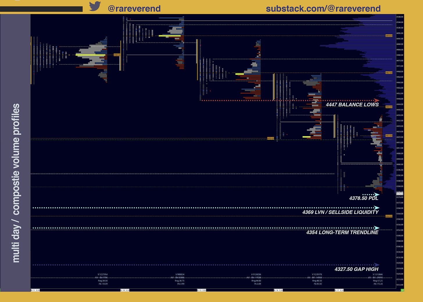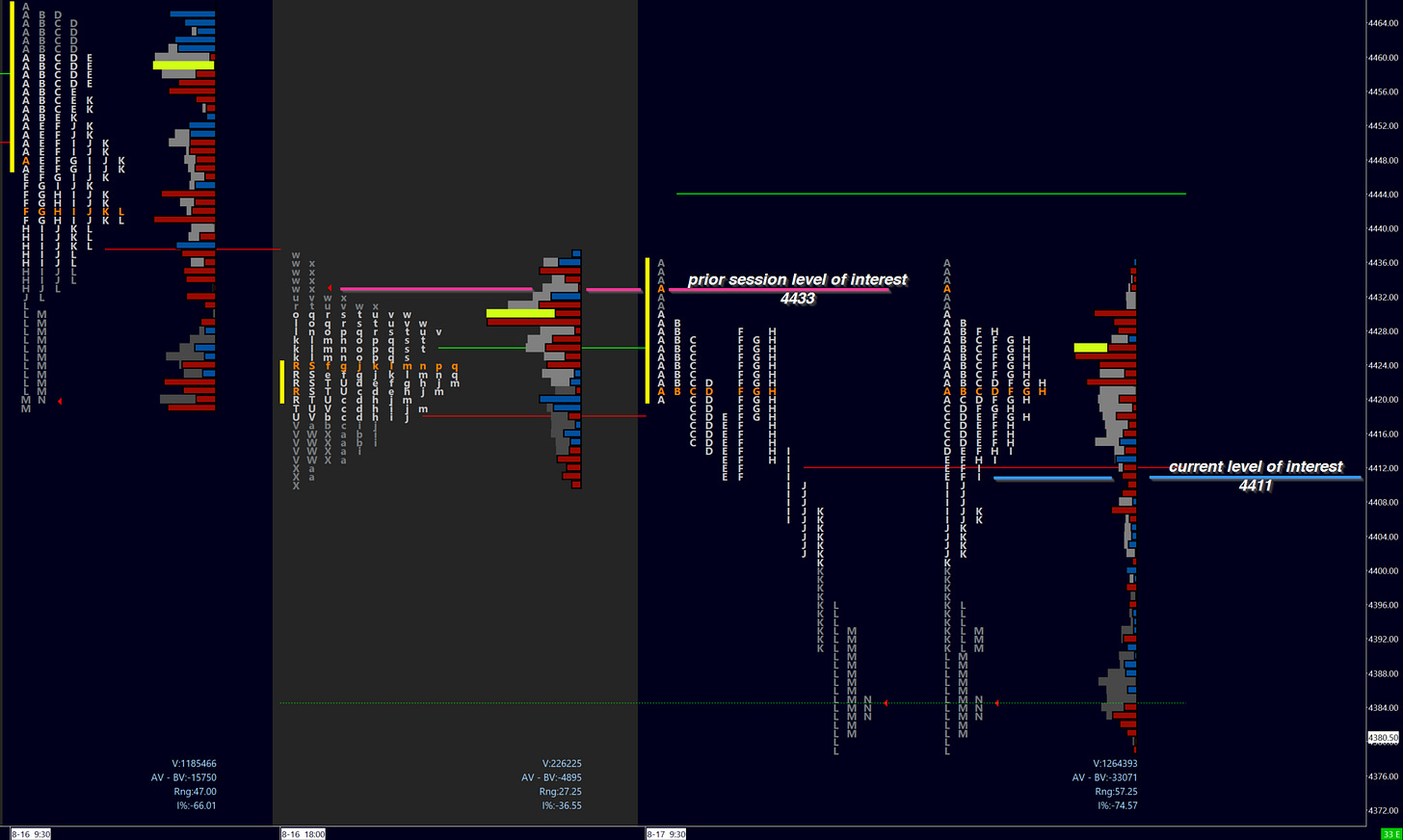 The RTH open was exactly at pivot. Failure to break the overnight high (ONH) was a prime ‘look above and fail’ scenario. This particularly good example will be posted in the substack and twitter (link) later. Another retest of the pivot in the opening range (OR, or first 30m) made a lower high, confirming seller presence - leading into one time framing down (OTFD) to the overnight low (ONL). It was here where buyers picked up to auction back through the day’s VA. It is no coincidence that 4411 retested in RTH as this was an important area of liquidity.