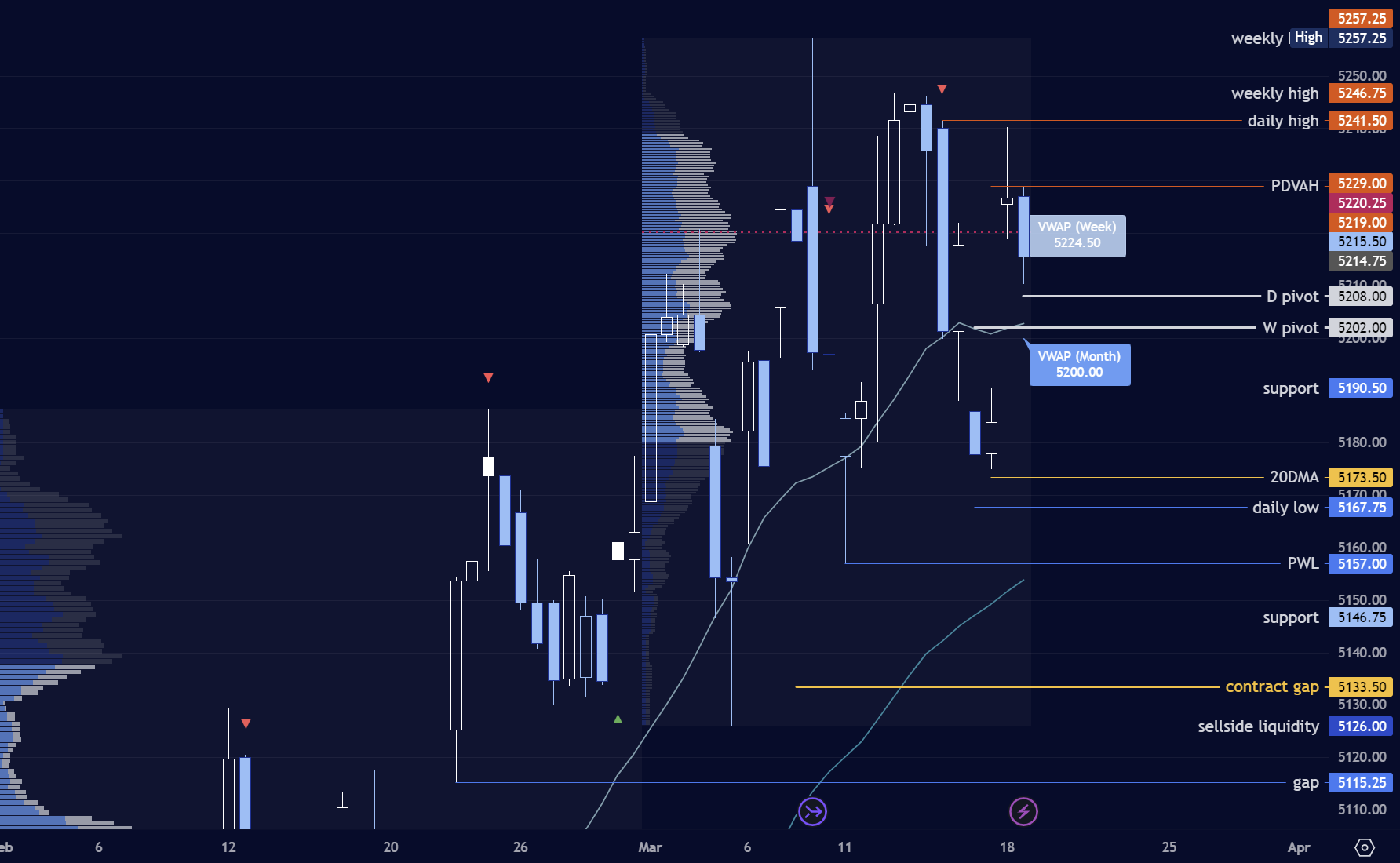 Inventory overnight as of writing is net short coming into the session. With the exception of a spike in the European open, the entire ETH was spent below Monday’s value area. We have now pushed into the 5190 level from yesterday’s plan.