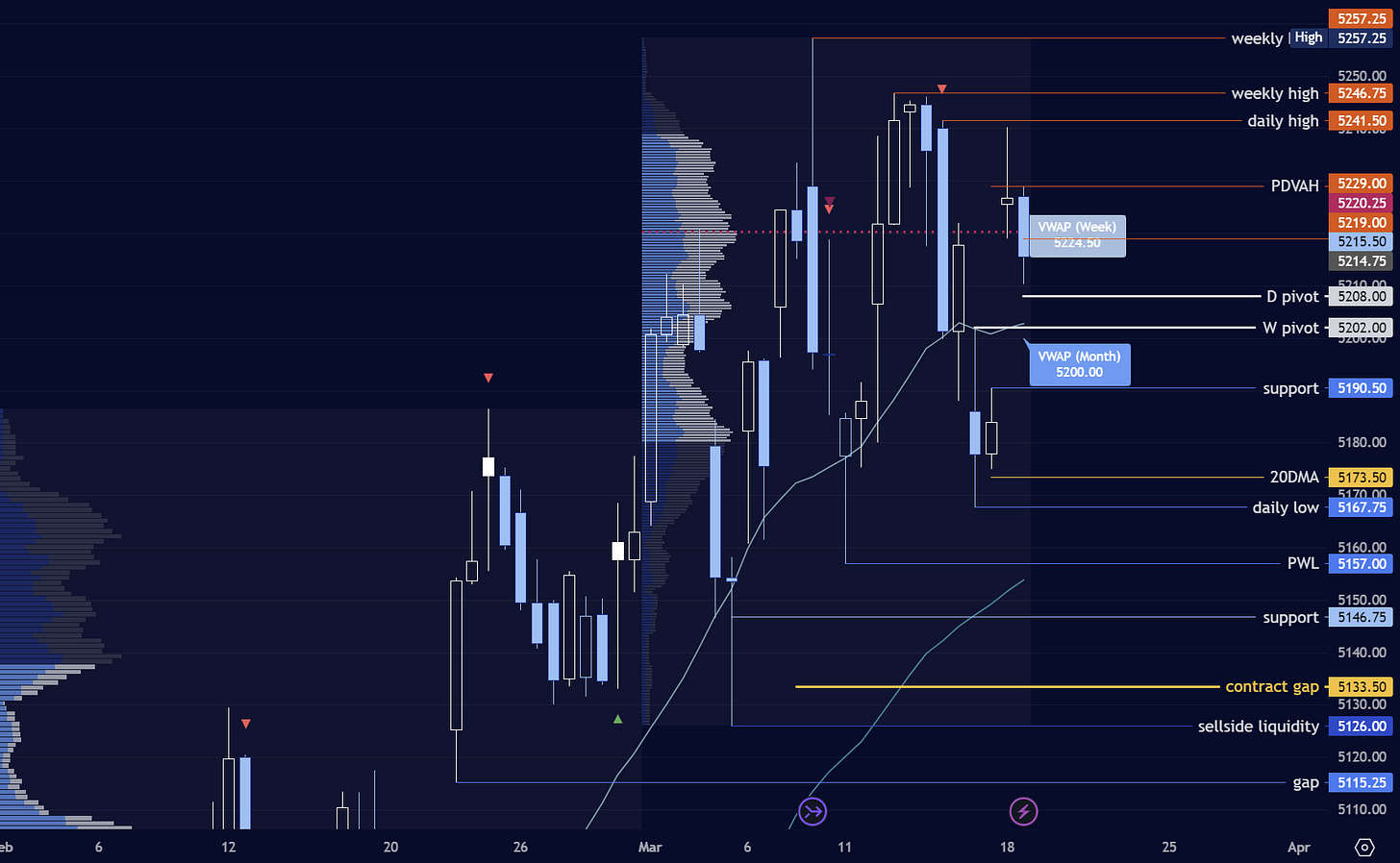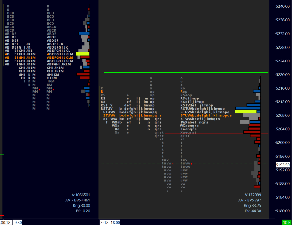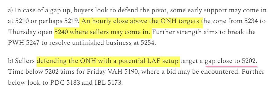 The look above and fail (LAF) scenario did thus play out but slowly over a few period, frustrating myself and I am sure a number of other traders. But it was clear from the intraday action that this was a strong area of supply and needed time to unload inventory. While I did suggest 5210 and 5219 as possible areas of support (actually 5212 and 5222 after observing flows), I thought sellers would take more initiative mid-day. Instead we were kept afloat by these two levels for the entire session.