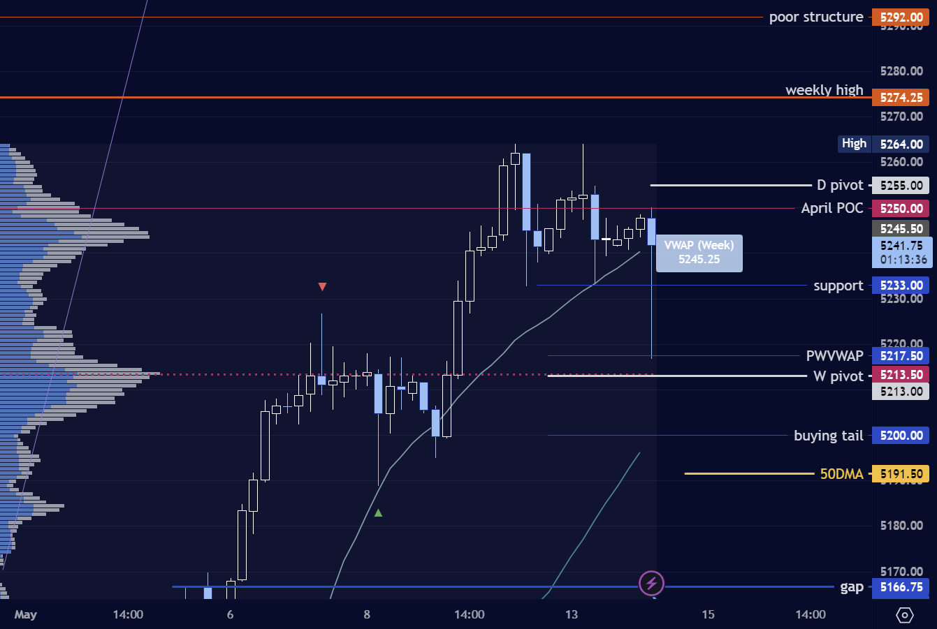 For the buyers, the 5255 level remains important, as well at the 5281-85 gate above it. The same is said for 5213 and then 5192 for the sellers below. I prefer to maintain today’s pivot at 5255 given its important in the overall volume profile. Finally, keep an eye on the prior two day low of 5233, which was already called out (5235) in the prior plan. This can be interpreted as a ‘secondary’ pivot.