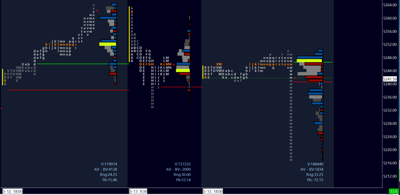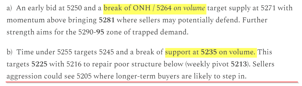 Friday and Monday ‘b’ profiles and price action were nearly identical. Even the levels were functionally the same, traveling from near 5263 to 5233-35 - both levels you read here in this Substack. Note the importance of volume at these levels, the reason is that I expect participants to passively defend these critical zones. Which will take a lot of volume to overcome. I typically denote these with a “🎯” following that specific level to be overcome.