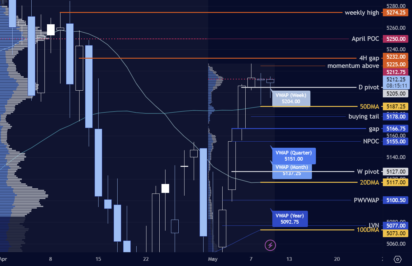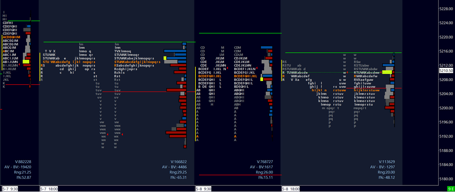 Pivot 5205. Primary thesis is a potential look above and fail of PD weak high to then challenge Wednesday’s buying tail. However volume above PDH could gain momentum especially after 5225 towards upside targets.