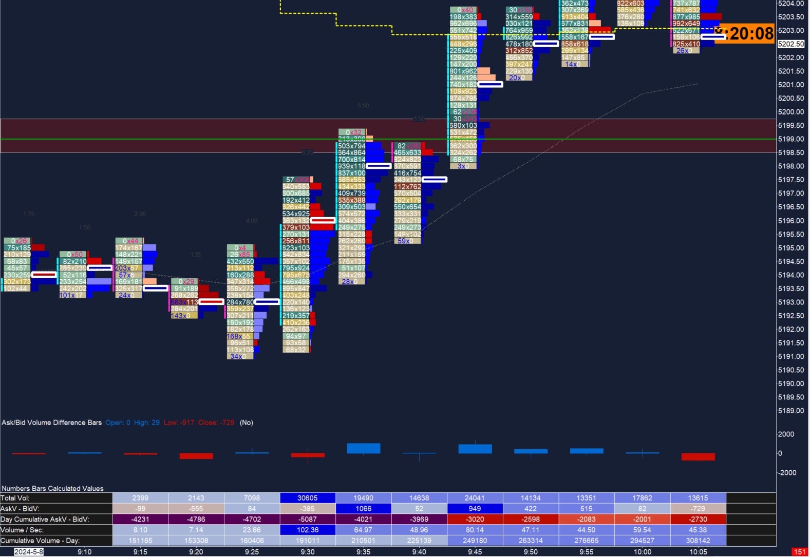 Image 2. ES 5m footprint, May 8. Note the lack of selling effort at the open