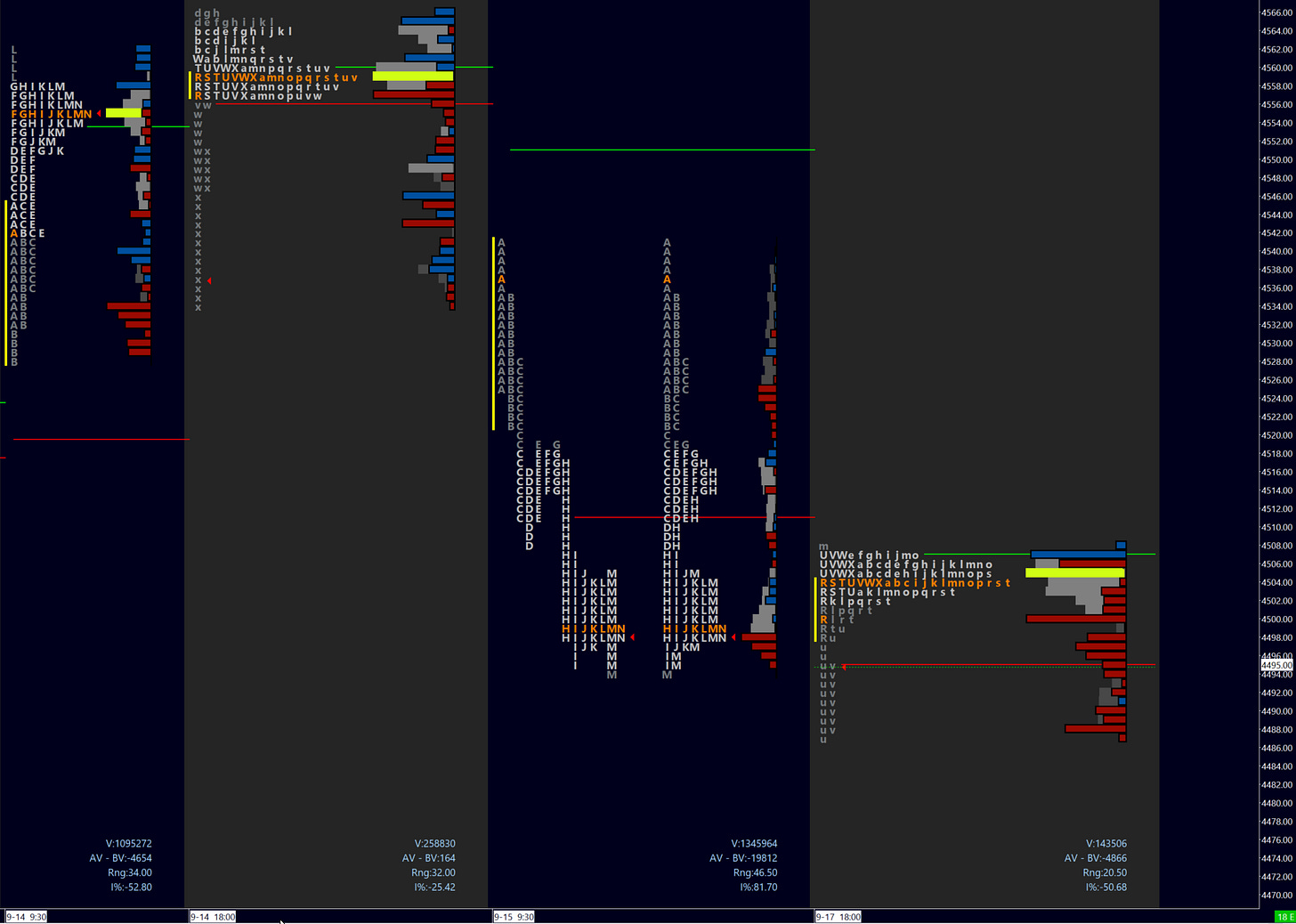 Buyer scenario. An hourly close above pivot can see further upside targets attempted. These would be Friday VAH 4518-21 (intraday buyside liquidity to IB low), 4529. Further above is Friday high 4541. Buyer case benefits from ONL defended early on. Keep an eye on sellside liquidity at 4485-8 if we open above.