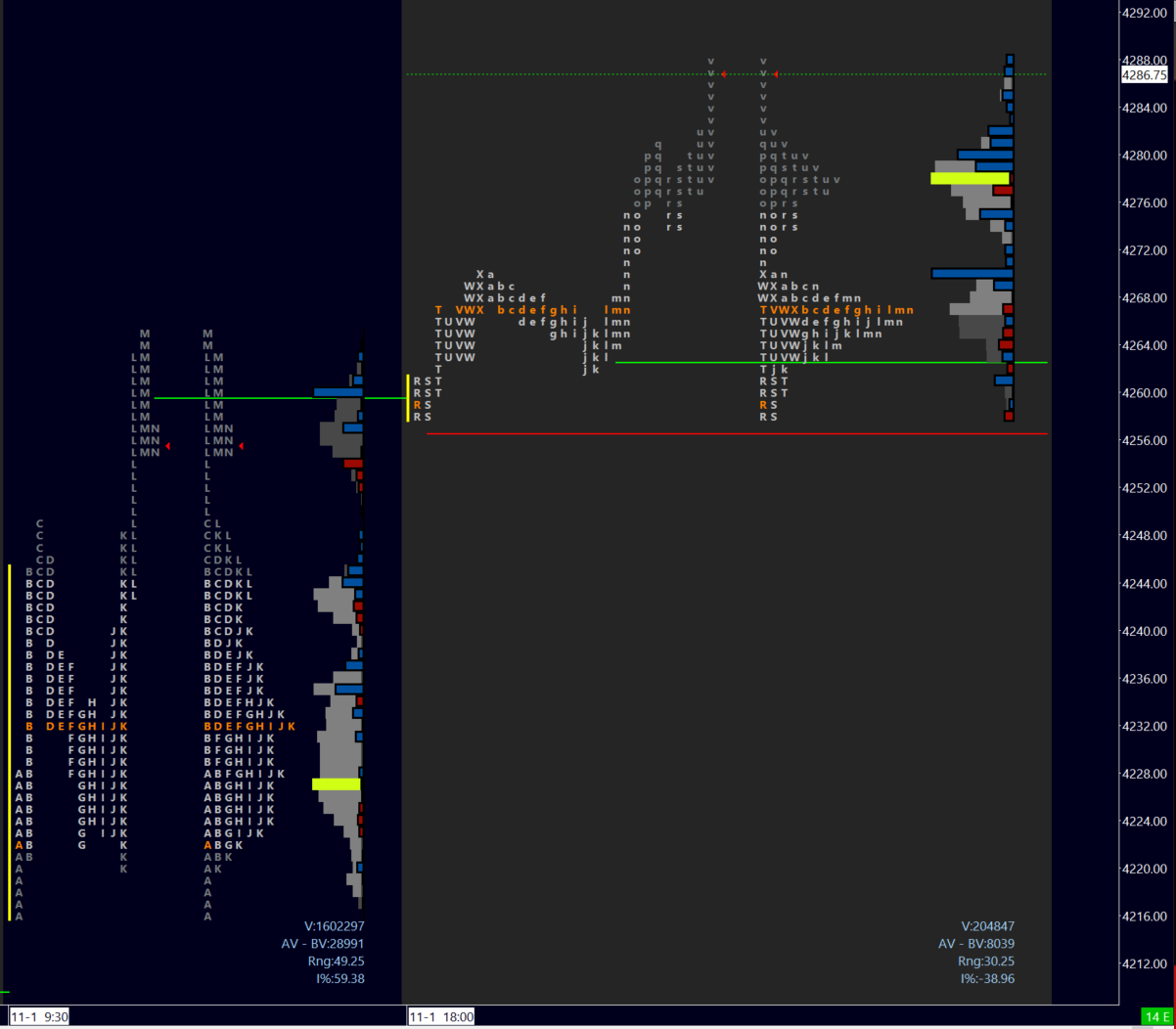 The day left a double distribution (but triple volume distribution, se image above) with a smaller node above LVN 4250. However for today’s session I will be focused on 4285 as the day pivot, which was our last target for the weekly note. This doesn’t mean we run out of targets, old structure will simply be in play. I have not see the buying volume I’d like with a strong bottom, so this is reminiscent of the short covering rally we saw last month. This doesn’t mean we can’t revisit much higher levels, but we aren’t creating a lot of support either.