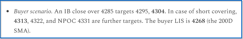 Buyer scenario. An IB close over 4340 is a bullish setup, resistance broken at 4357 could target 4367, 4378, 4390, with ultimate target 4404 above. The buyer LIS is 4321.