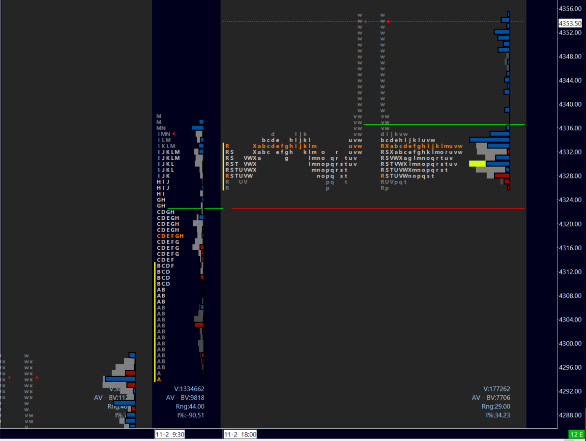 Yesterday’s gap held with barely a look below which saw an effective OTFU off of our pivot 4285 - the previous week’s high. This saw buyers hit all targets in the long scenario from yesterday’s Missal, leaving a triple volume distribution behind (image above) - as well as unfilled gaps from the week. We are looking at potentially yet another one today.