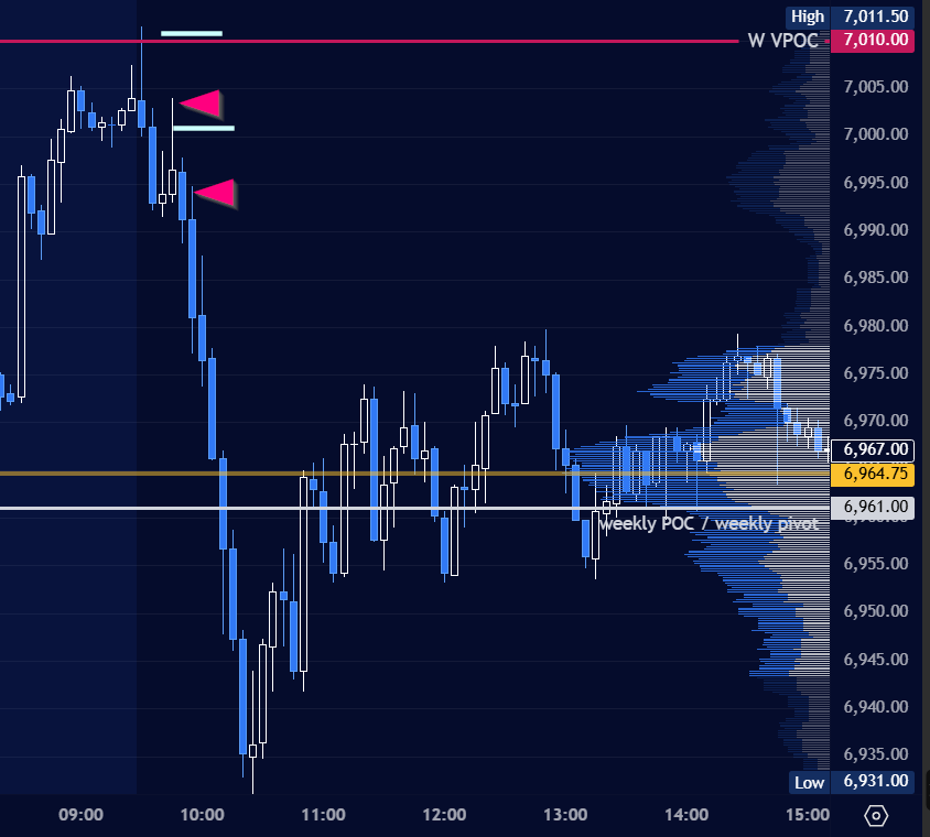 A clear ‘look above and fail’ (LAF) of the prior day high. It’s furthermore a few point above the key 7000 level. In other words, good confluence which means higher chance of a reaction.