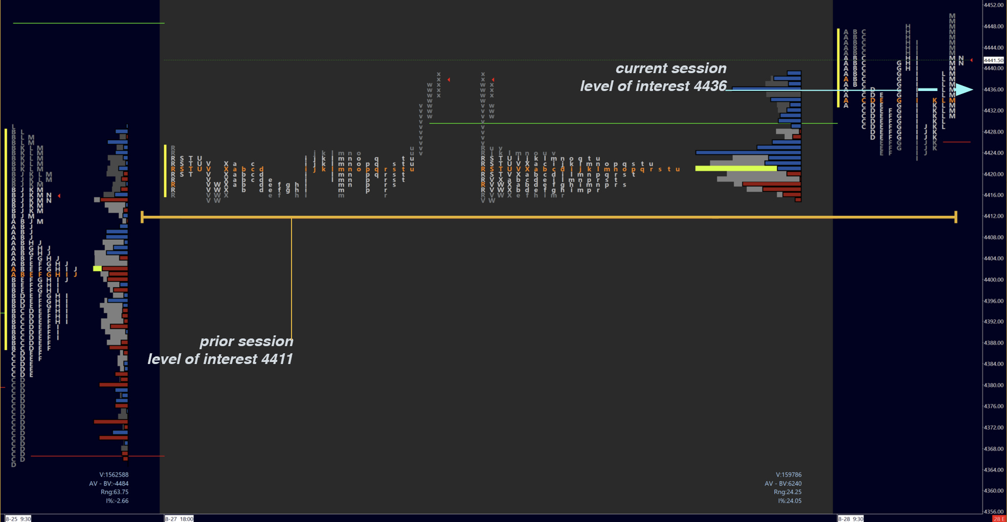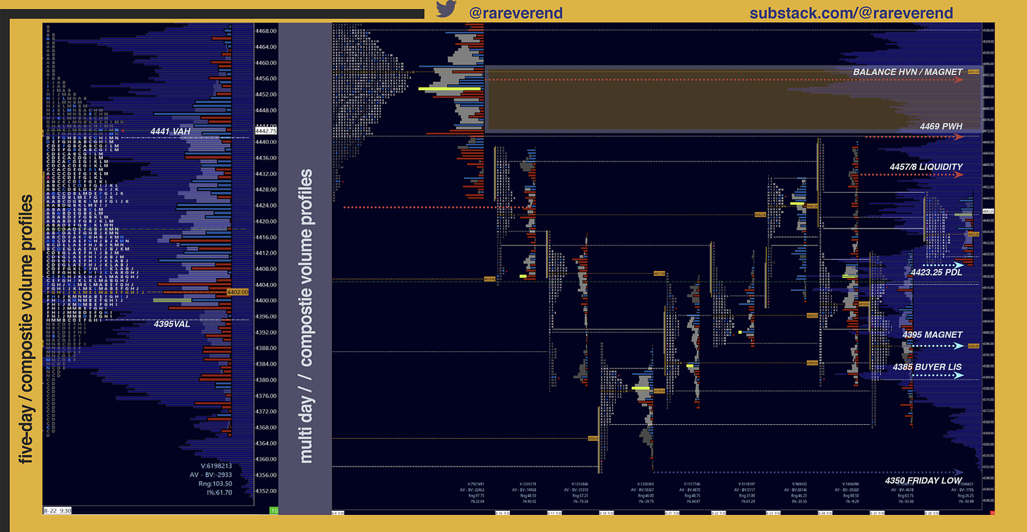Seller scenario. Sellers look to defend the ONH. A break of 4425 on momentum targets weekly pivot 4411, with 4395 Friday POC below.