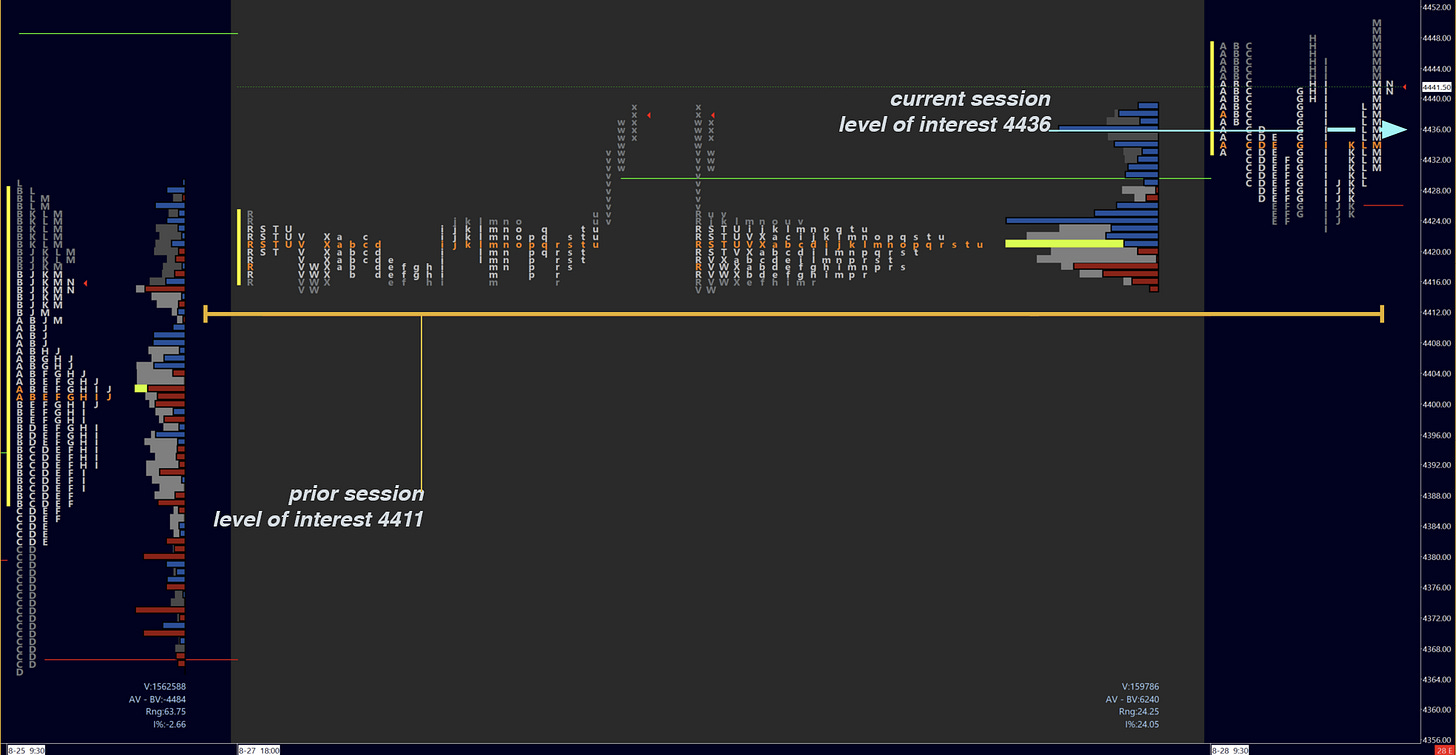 A second rotation led to a NLOD, also only two ticks lower before rotating toward the highs once again into close - this time leaving behind a weak high just shy of two points. Again, sellers stepped in, closing the session near VAH. Overall an indecisive day leaving a weak high and poor low, but filling in Thursday’s poor structure noted in the Weekly Outlook. Given rotation around 4436 today this will be our level of interest heading into the next session.