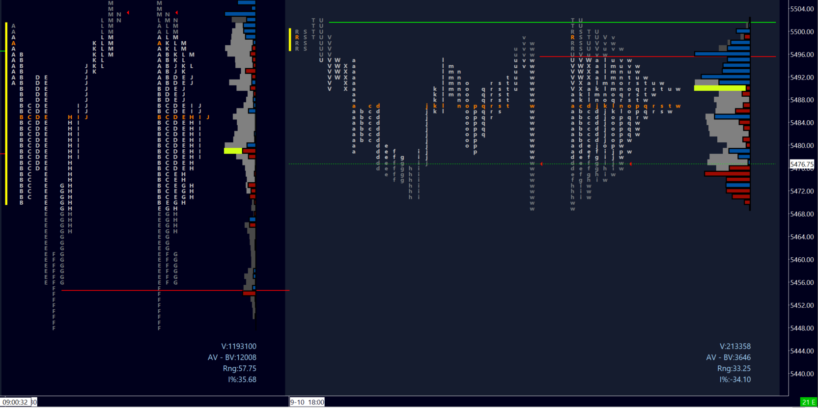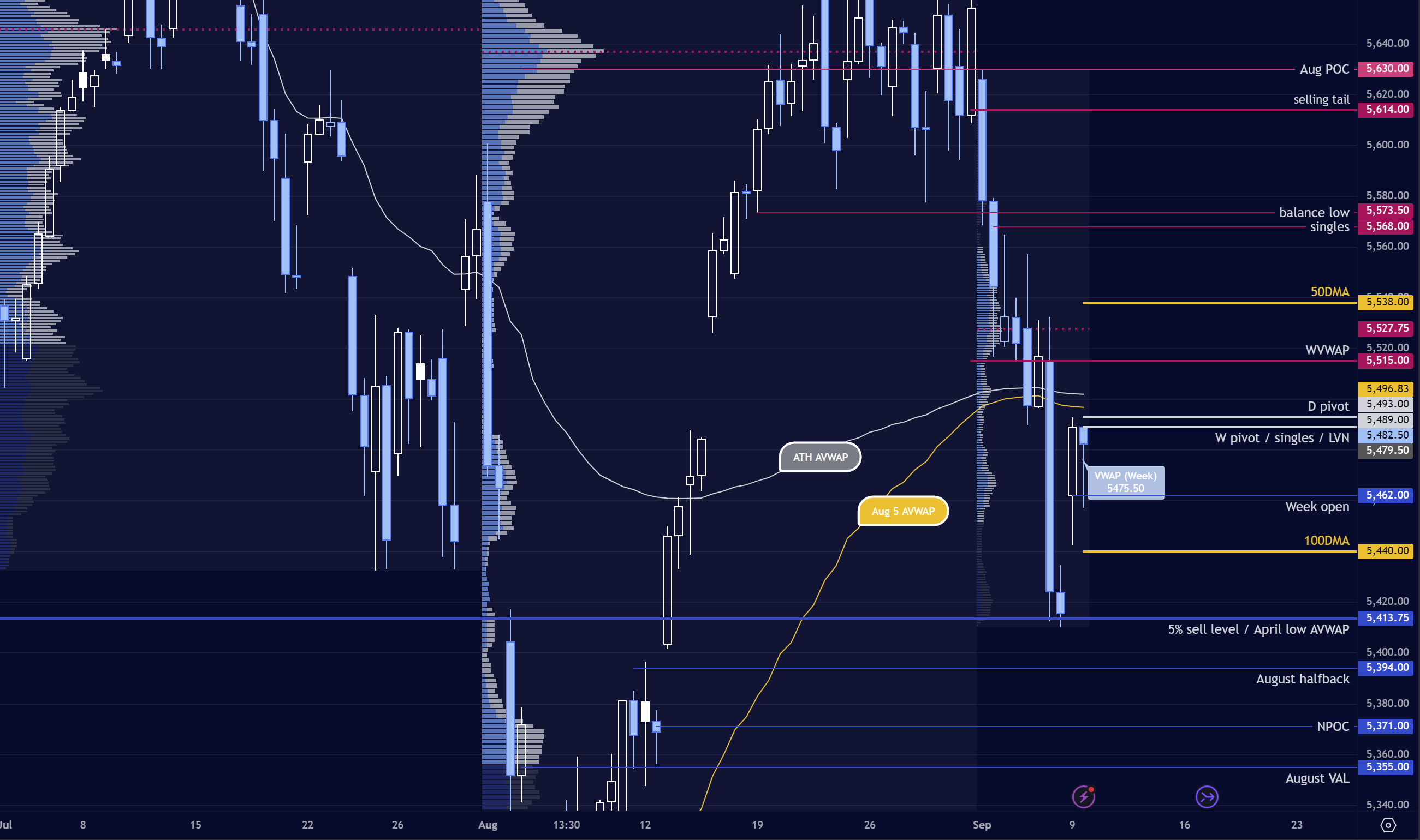 b) Time below pivot and volume below 5479 target PDVAL 5470, 5446 100 DMA where longer-term buyers may be encountered. Momentum below looks for 5435, NPOC 5421 and 5411 at an extreme.