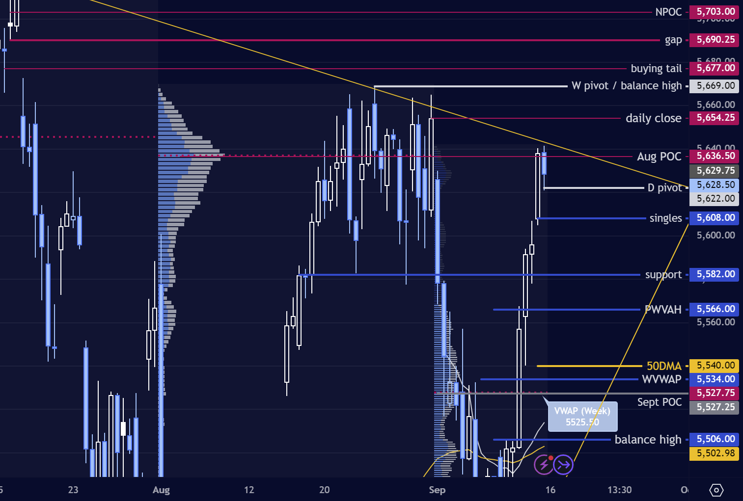 Expecting some balance ahead of FOMC with possible tests into and above the prior ten-day balance high, or 5669 (~5730 in the December contract).