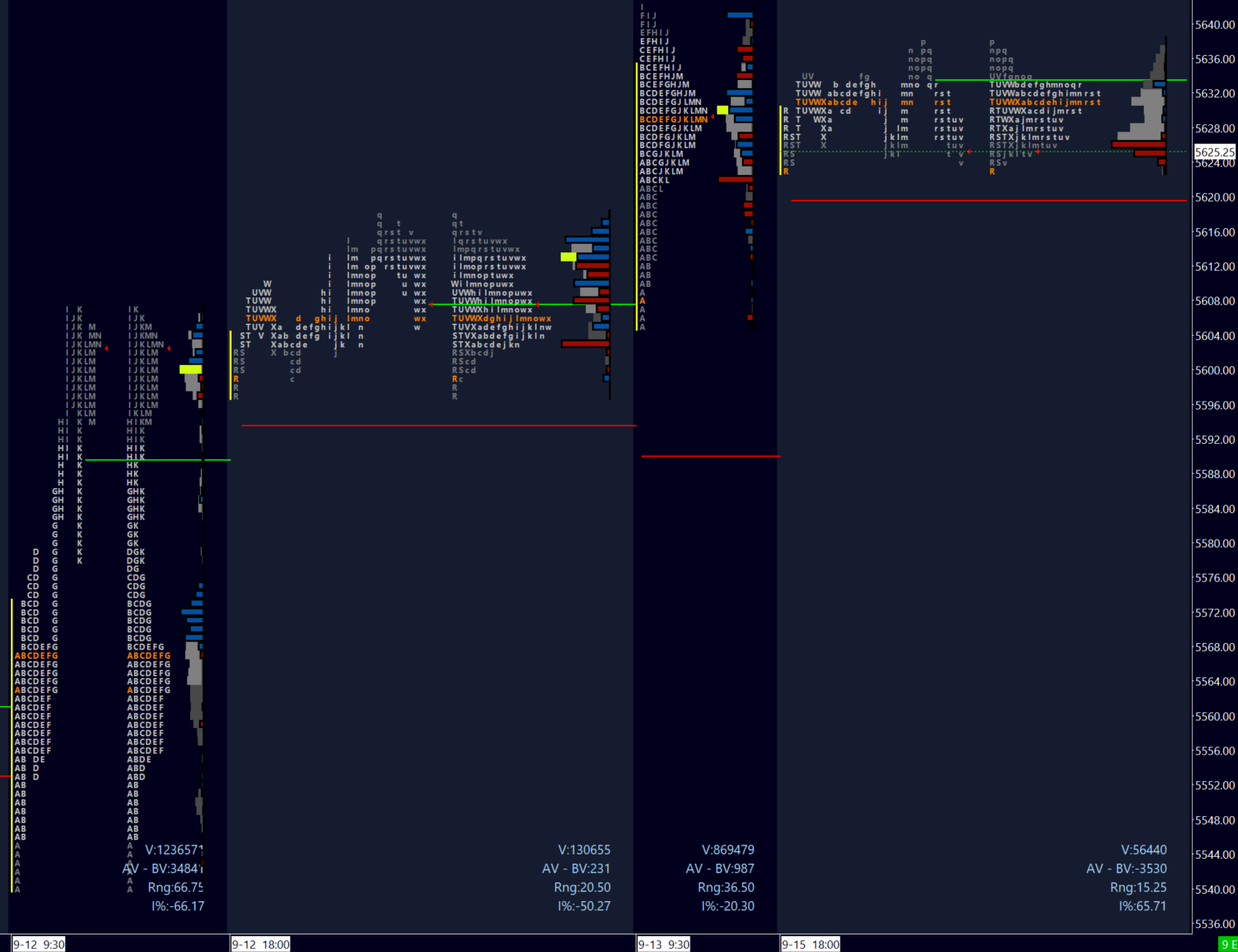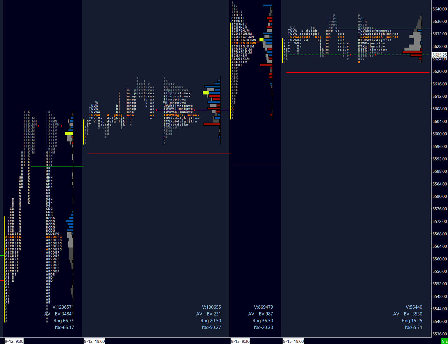 Back to price levels, buyers look to close the gap above which is the main upside target. Sellers look to address thin structure below, with a repair of singles to 5608 which can coincide with a break of daily OTFU. In this case I am watching the area around 5585 for further support. I’ll be using 5622, or Friday VAL, as Monday’s pivot level.