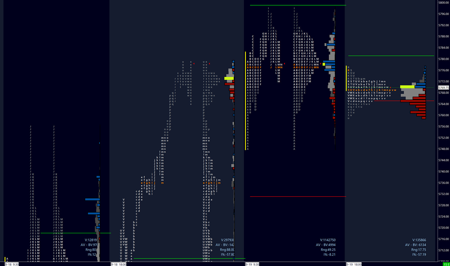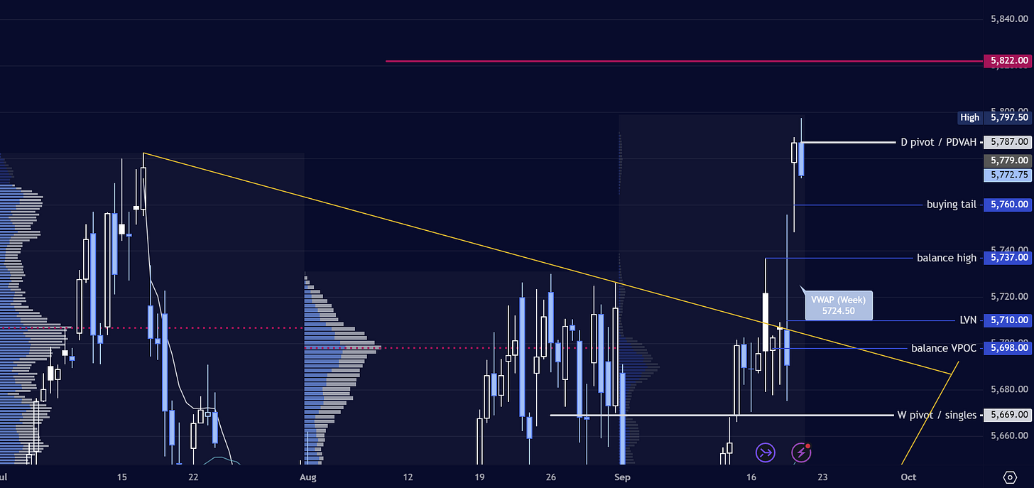 The plan is fairly simple here. I will use 5788 as the day’s pivot, Thursday’s first level of resistance as well as the day’s VAH. Bears look to spend time below Thursday’s buying tail, breaking the low to maintain the daily in balance. I observe weak excess at the highs - longs will look to explore above the daily high and into the week’s upside targets.