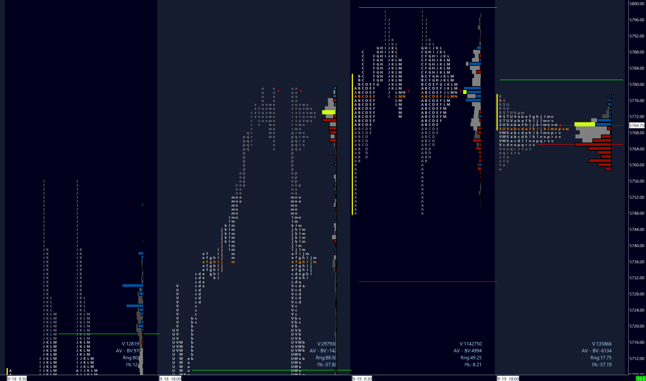 b) Defense of the pivot and time below 5760 target 5745 to Wednesday buying tail base 5740 which may encounter a bid. Further weakness targets liquidity at 5730 and value area 5716 at an extreme.