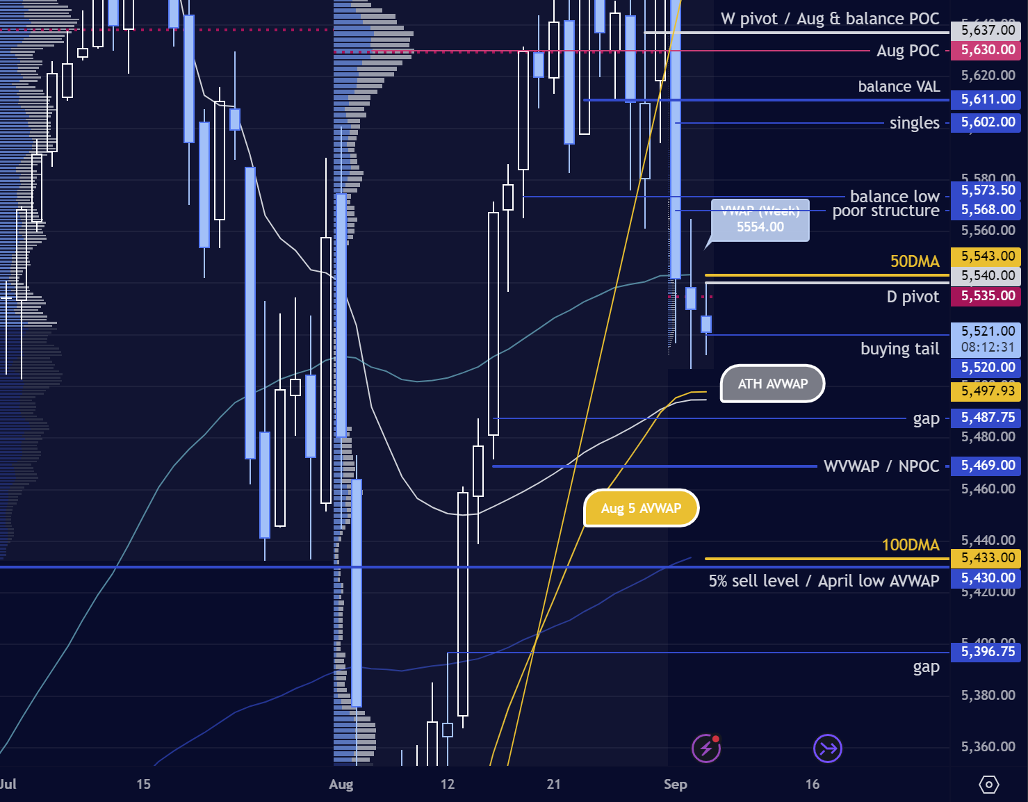 b) Time below pivot and a break of the ONL on volume target 5495 and 5488 gap fill. This area could see a responsive bid with congestion of the ATH AVWAP and swing low AVWAP around 5596 (Image 4). Further weakness would aim for the 5469 NPOC and 5455 buying delta at an extreme.