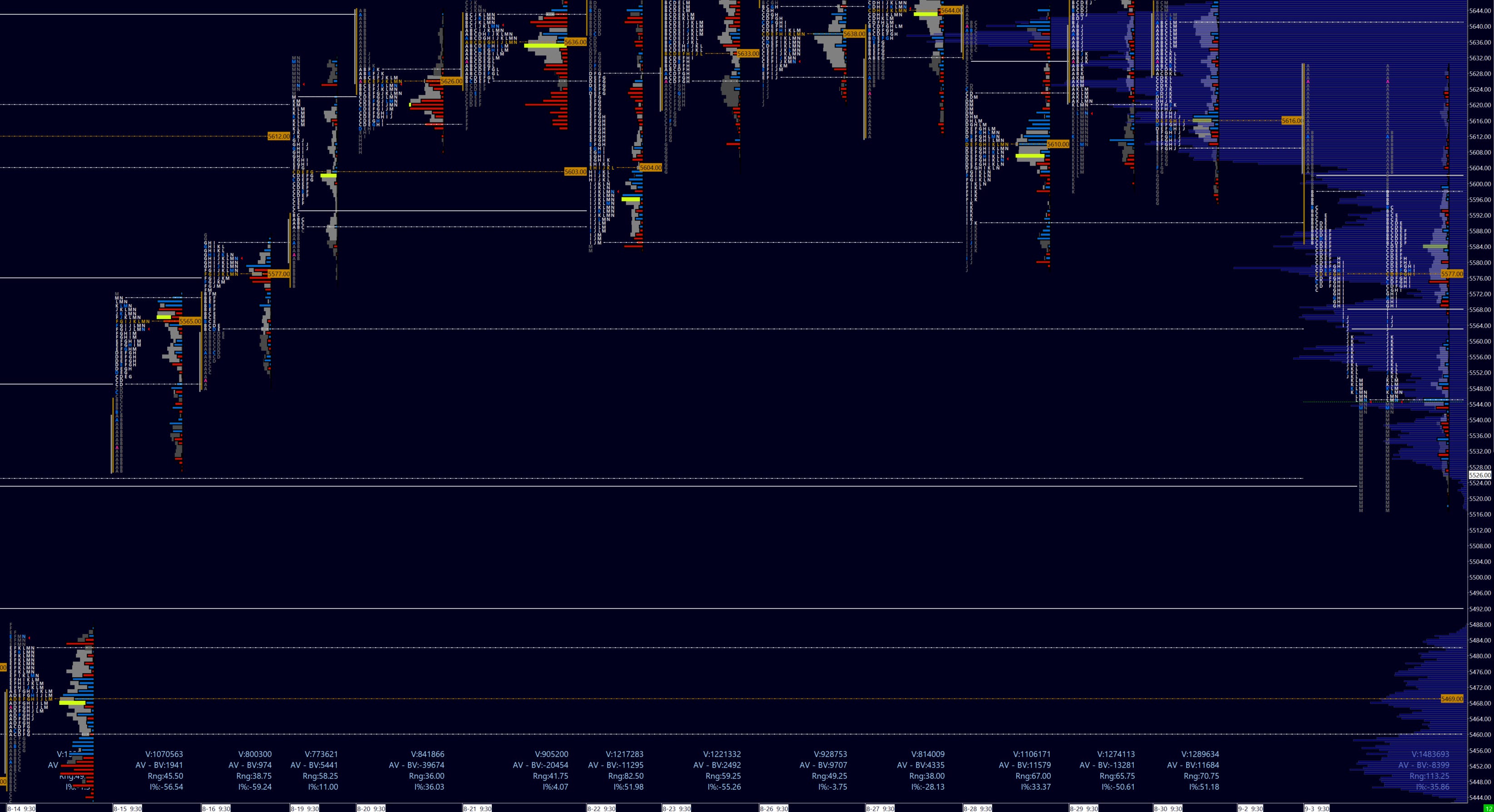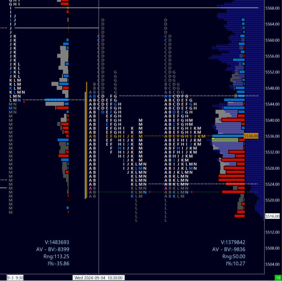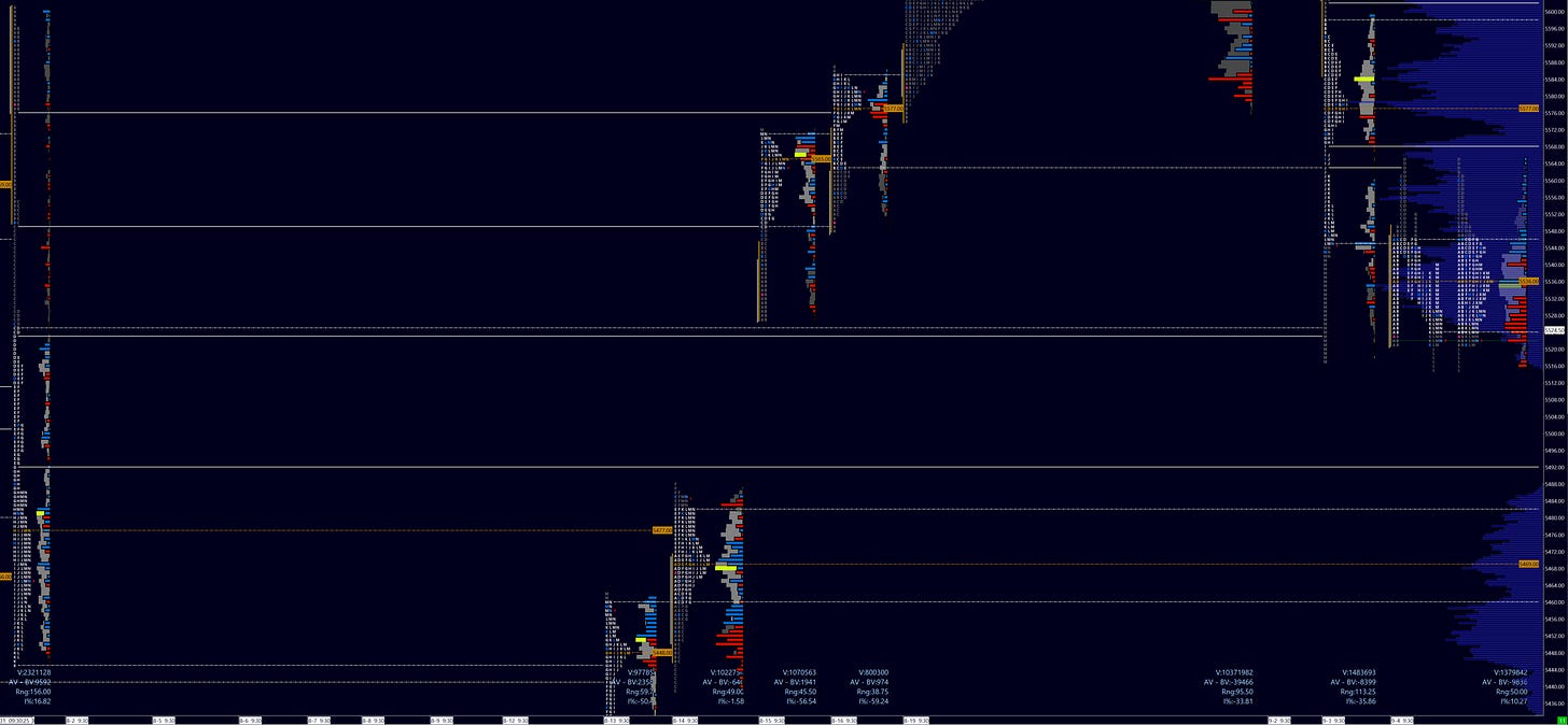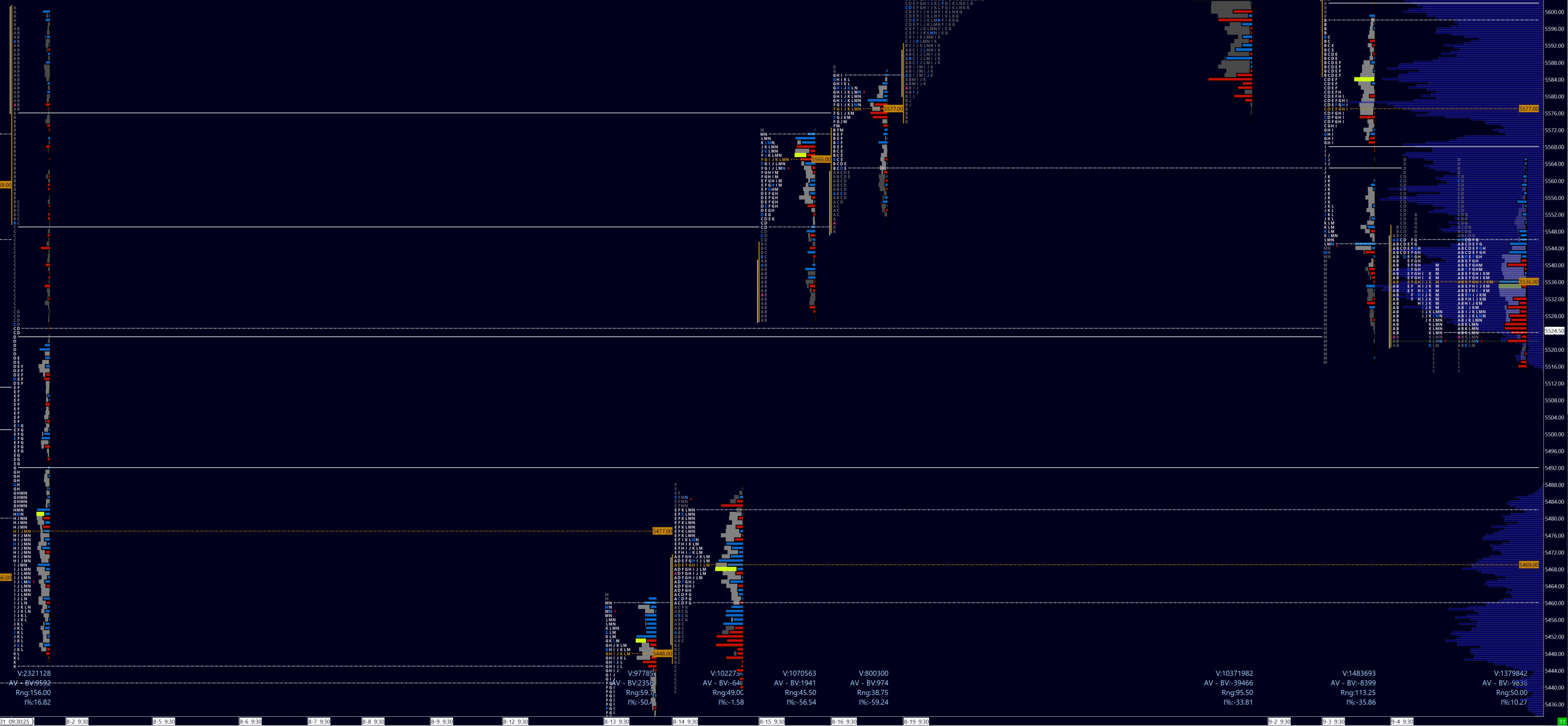 Pivot 5540. This is Wednesday’s closing spike high - liquidity grab or testing to see what’s above? We’ll find out today. It’s also a interesting area of ‘delta spilt’ - where order flow opinion was divided. Check out the image below.