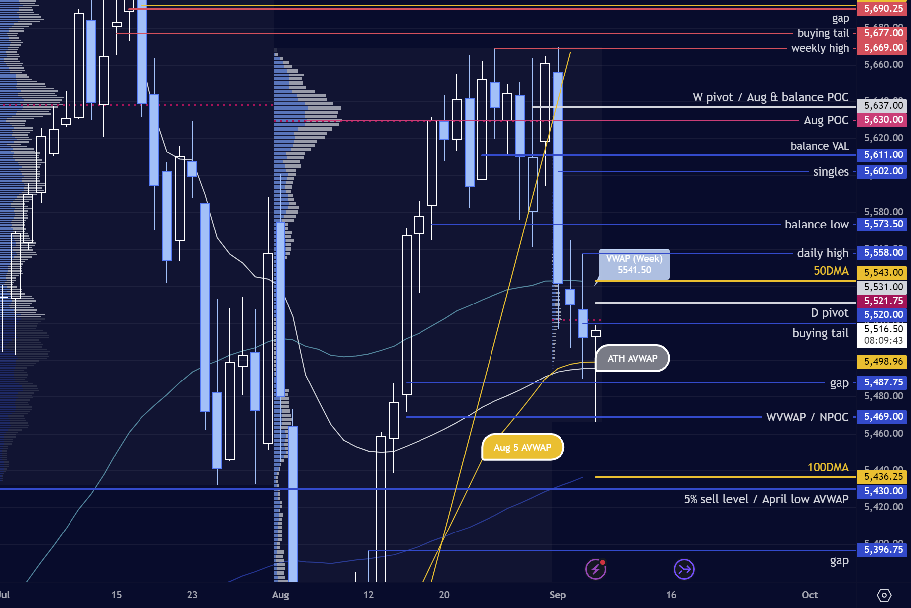 b) Time below pivot, below 5511, look to break PDL on volume into the ONL / 5469. Further weakness targets 5452, 5445, with 5432 (confluence 100DMA and 5% sell level) at an extreme.