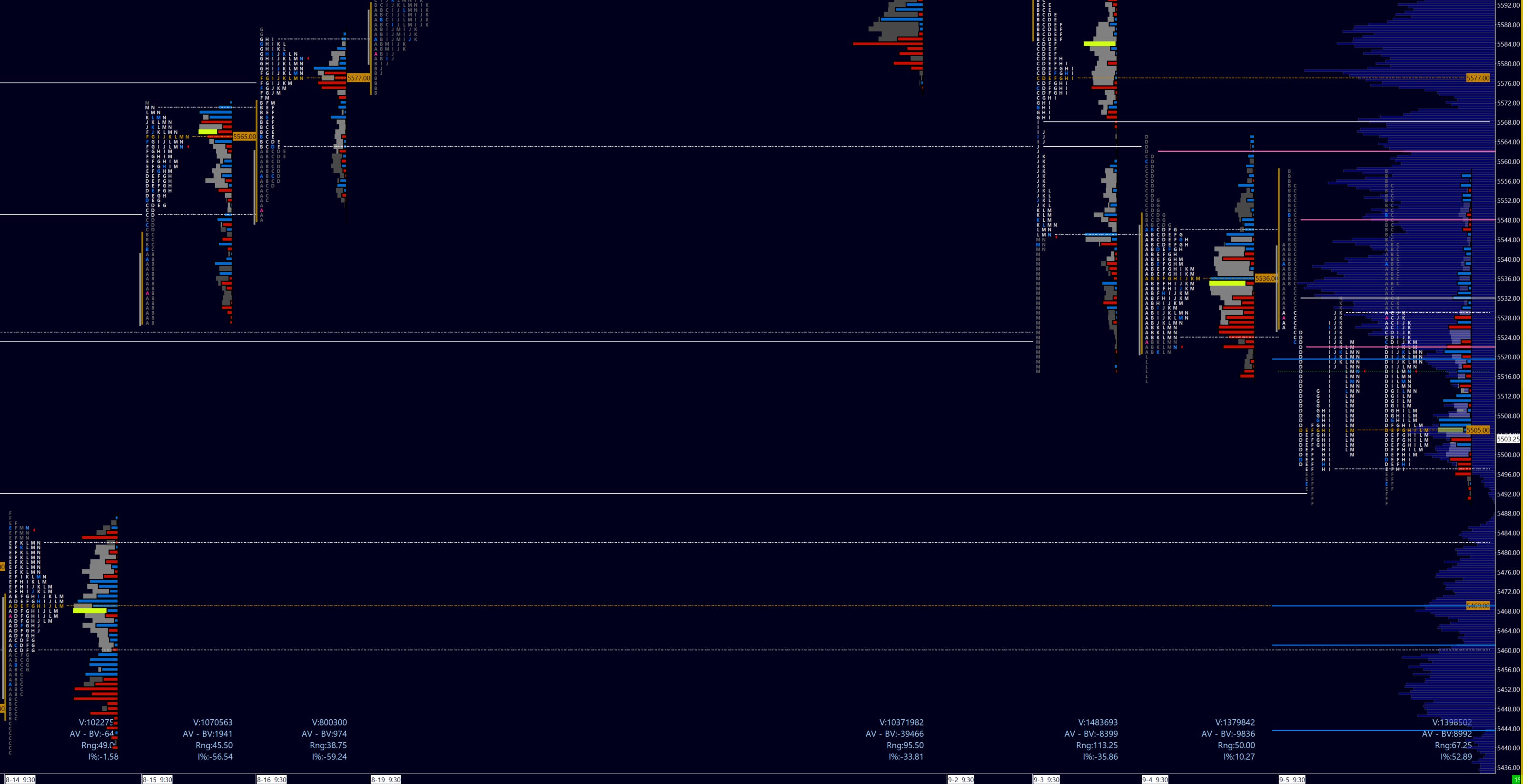 a) Defense of the ONL / 5469 NPOC, over PDL 5490, break of ONH look for consecutive closes over pivot. Similar levels above: 5543 50DMA, 5558 PDH to 5568 where selling may be encountered. Momentum could see NPOC 5577 / balance low. Recall further levels 5595 and 5602.