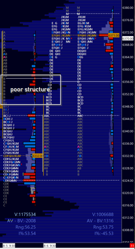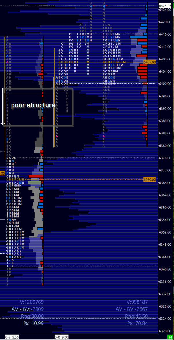 If we open within or see IB trade into the area of poor structure, chances are that an early revisit and reject of a key reference (like a VAH/VAL, or buying/selling tail) will see half, if not all, of the day’s trade filling or retesting that area.