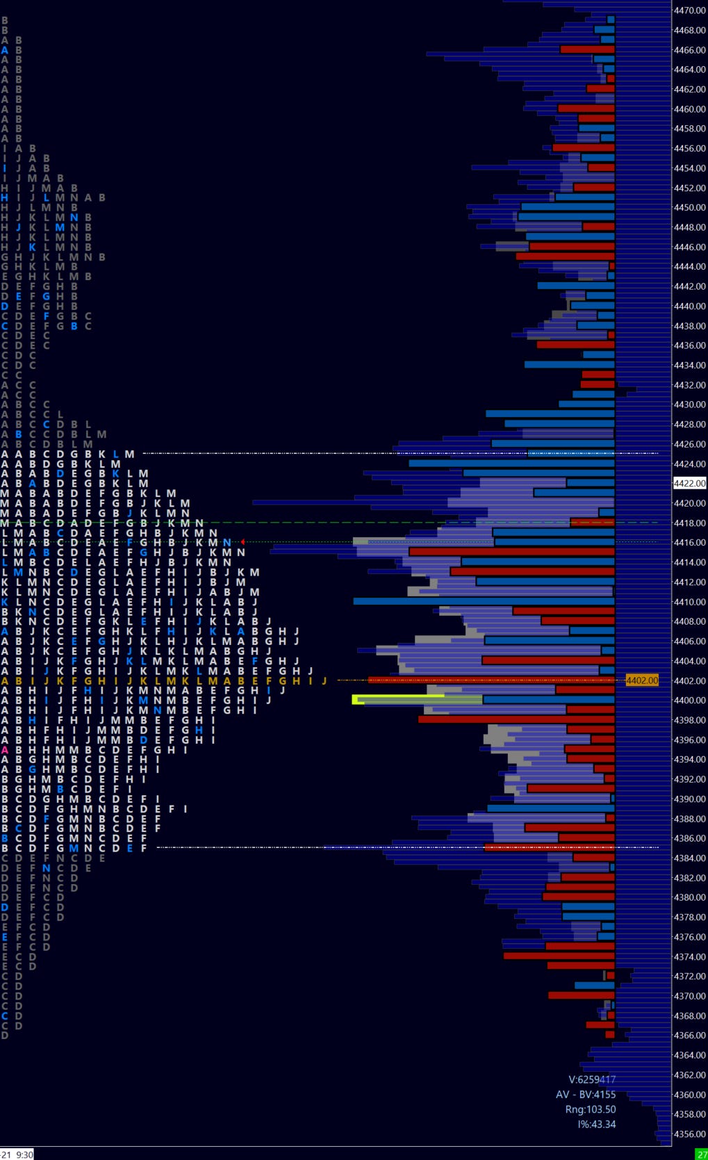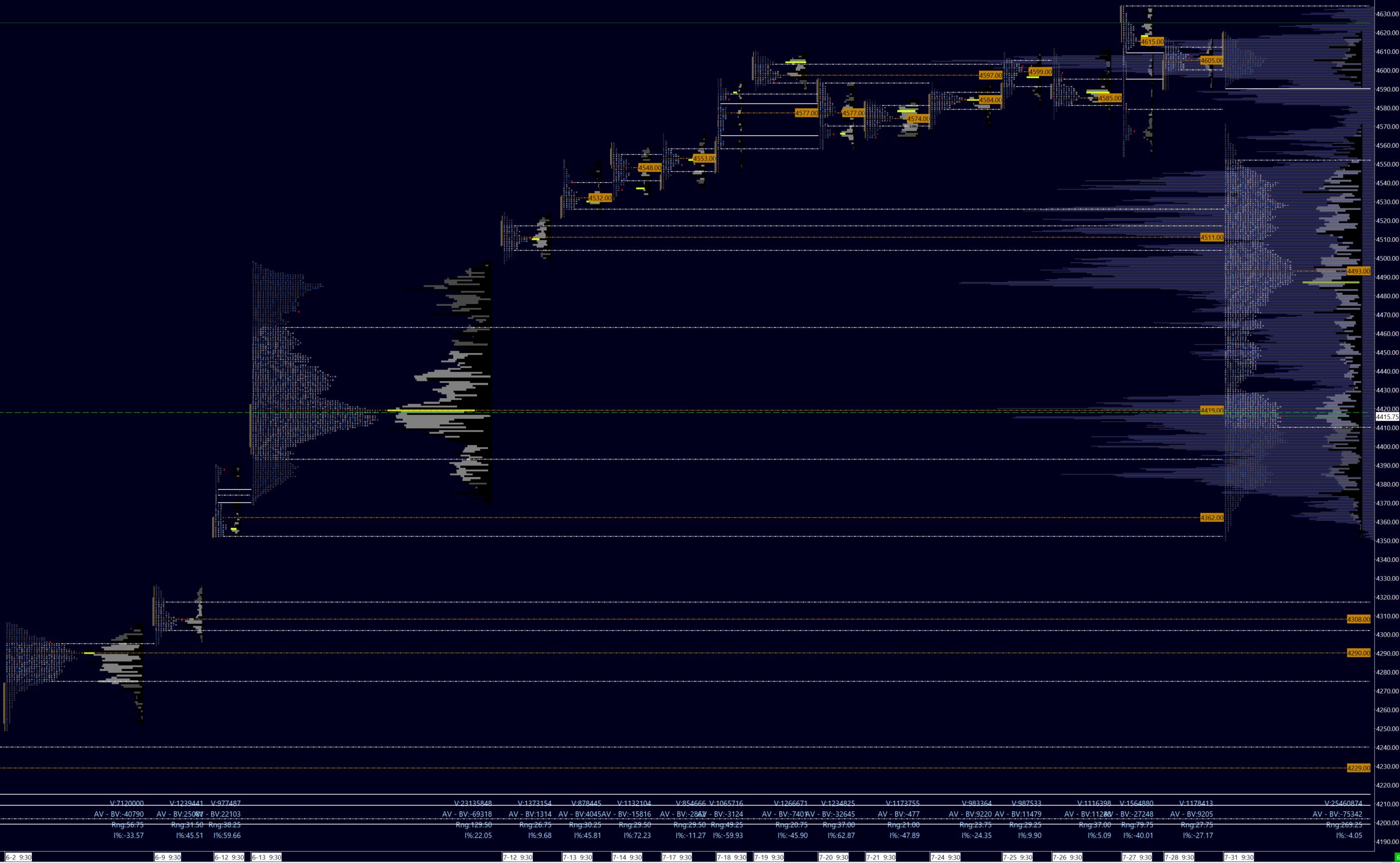 Meanwhile the weekly profile reveals two distributions, the lower containing short-term value (5-day) at 4402, and the smaller upper distribution above LVN 4433 and WVAH 4425. Buyers will look to see a daily close above this LVN for a possible continuation higher. Sellers will look spend time below value to break 4365 and close below 4350 for possible price discovery to the downside.