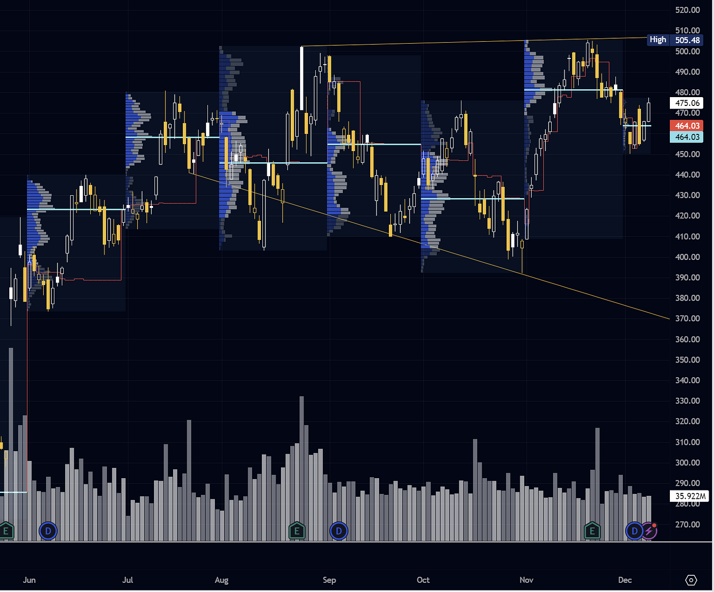 Finally, the AI binge may have run its course for now, with NVDA struggling to regain 500 and trapping more hopeful longs. Look for resistance at November POC 481.50, a likely pivot area. A break of 487.50 further above could see longs attempt 500 once more. I think 530 is the ultimate prize for bulls in this cycle. Shorts meanwhile would be assisted with weakness in the indices, targeting 445-50 support. A break can see a 423.80 4H gap fill, with shorts eyeing 405 further below and an area of likely passive buyers.