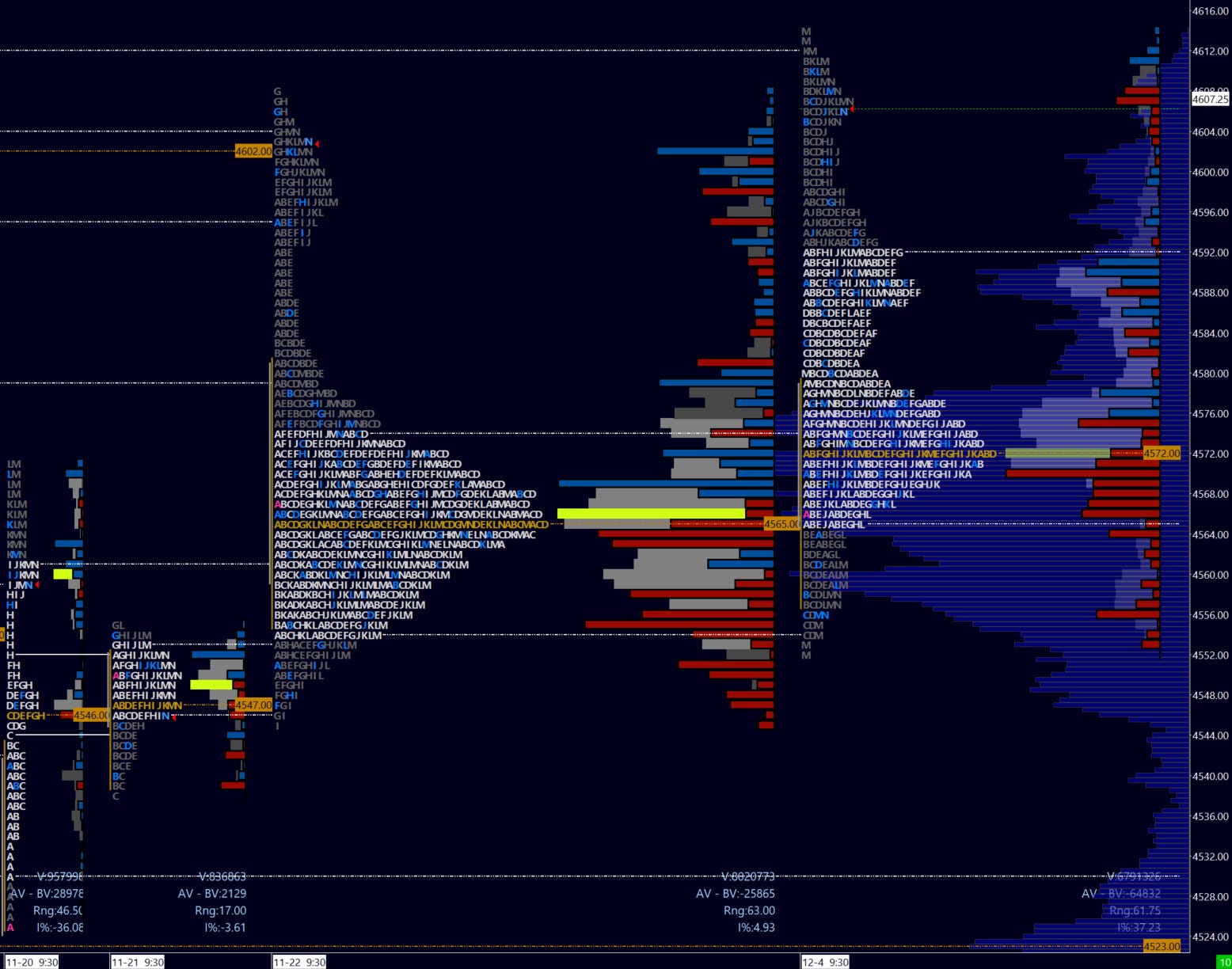 But in the meantime see below last week’s profile next to the prior area of balance…not much to give bulls nor bears. Sellers were persistent below 4575 but not enough to overcome passive buying. Buyers on the other hand could not gain momentum to make a decisive break into year highs ahead of contract rollover. A note on that - I will be rolling over beginning Monday. Prior levels remain relevant and I do not adjust from new contract levels. For reference, December ESZ23 settled at 4606.25 and March EPH24 at 4658.75, a delta of 51.50 points. Going forward keep in mind the contract gap to 4606.25.