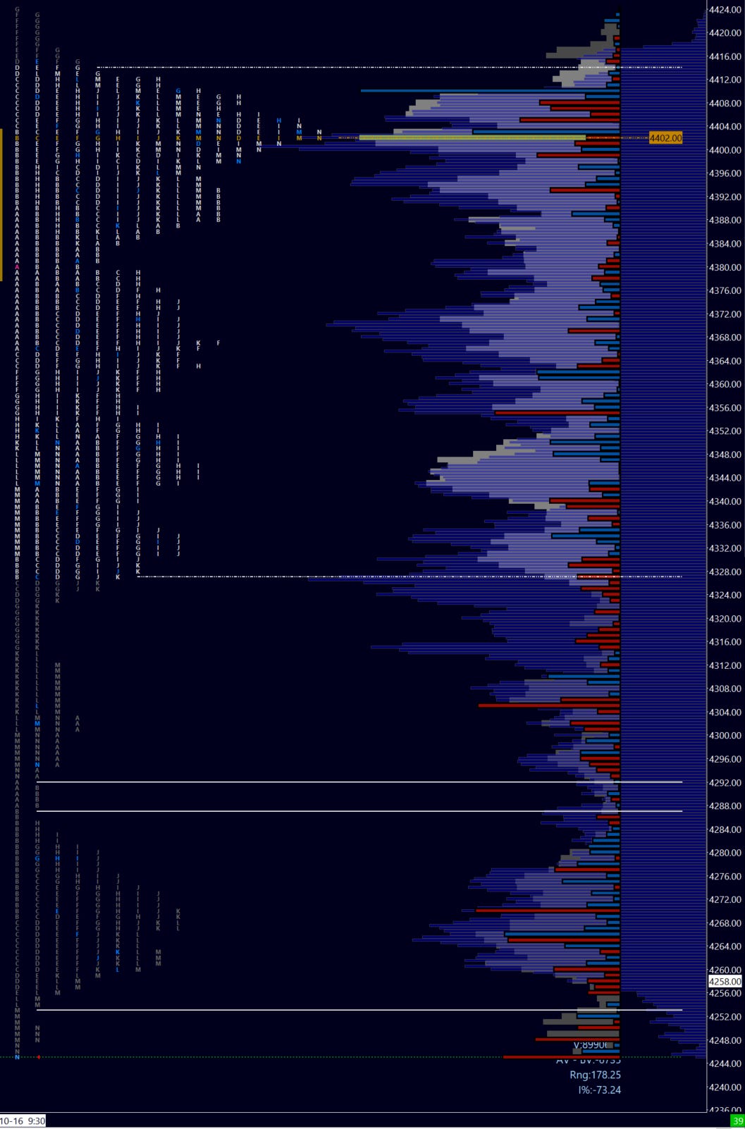 And that’s a trap! Following an enthusiastic ‘open-drive’ on Monday with an afternoon dip seemingly confirming interest, the uh-oh moment that should have been was the failure to make a NHOD and the close below our key level from last week of 4405. The p-shape distribution suggested buyer absorption. The following day was worth studying, as an initial look below and fail breaking the prior five day balance high turned into a look above and fail once the gap above was successfully defended. The identical close to Monday’s revealed that sellers were indeed still very present above 4400.